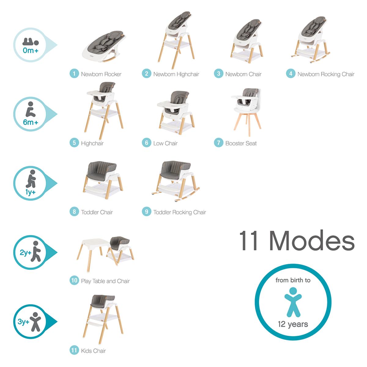 Looking for the ultimate versatile high chair - look no further than the Tutti Bambini Nova Evolutionary High Chair! Designed with multiple functionality, the Nova high chair has 7 modes designed to grow with your little one from birth up until 12 years of age (with additional add on's 11 modes are possible). From high chair, to booster seat, to play table; this smart design adapts to suite the needs of your little ones. Available in a choice of colours and also including a carry case, this is the only high chair you will ever need!.