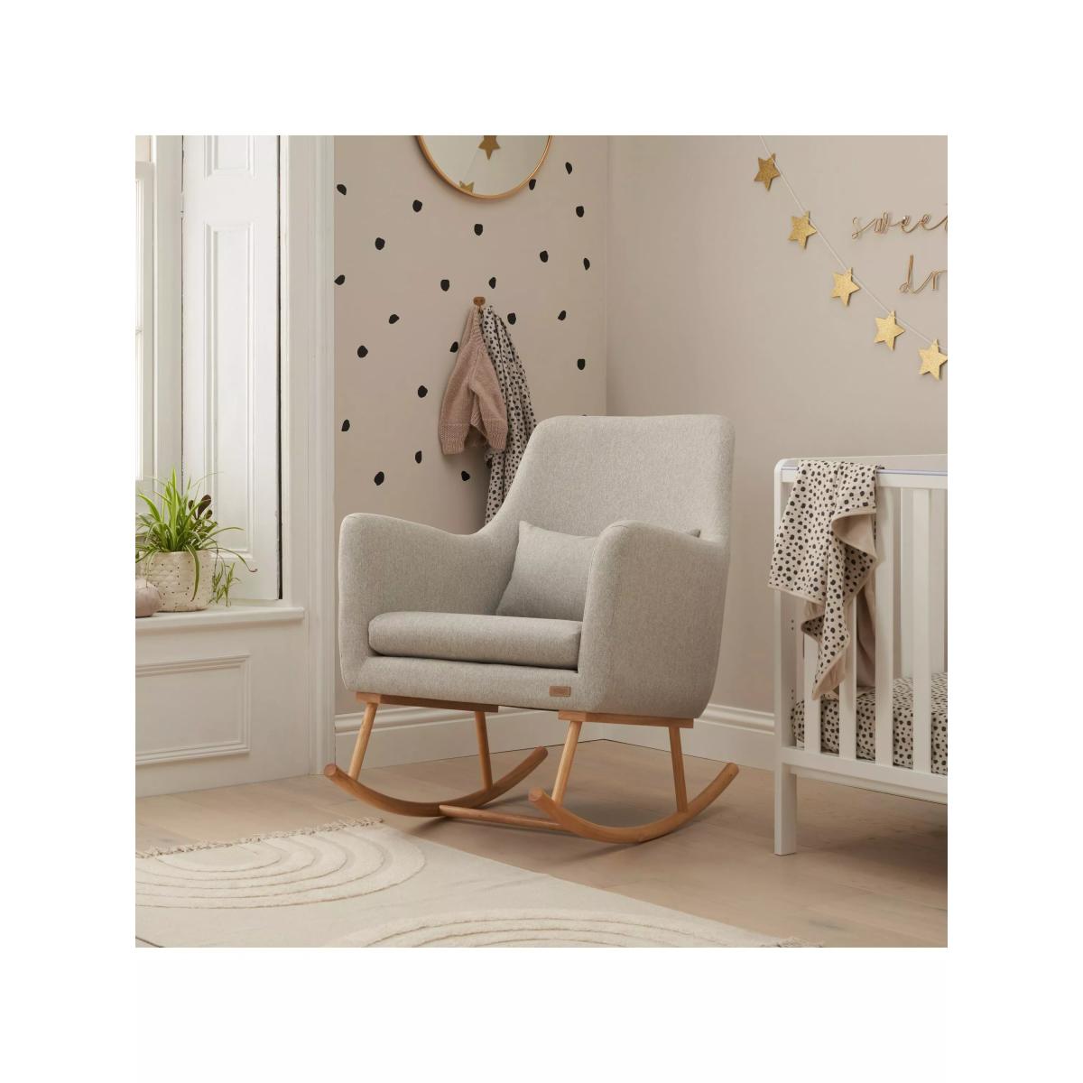 I love this rocking chair for its sleek, minimalist design that easily complements a range of nurseries and living spaces. It's particularly well-suited for Scandi-inspired interiors due to its soft neutral upholstery and natural wood base, but it can also add a touch of calm to more eclectic or modern schemes. Practical styling tips include pairing it with cosy cushions or a textured throw for added comfort, and placing it near a window or gentle light to create an inviting, nurturing corner. Its versatile look means it works equally well next to soft pastel palettes or muted earthy tones, making it both functional and stylish for everyday use.