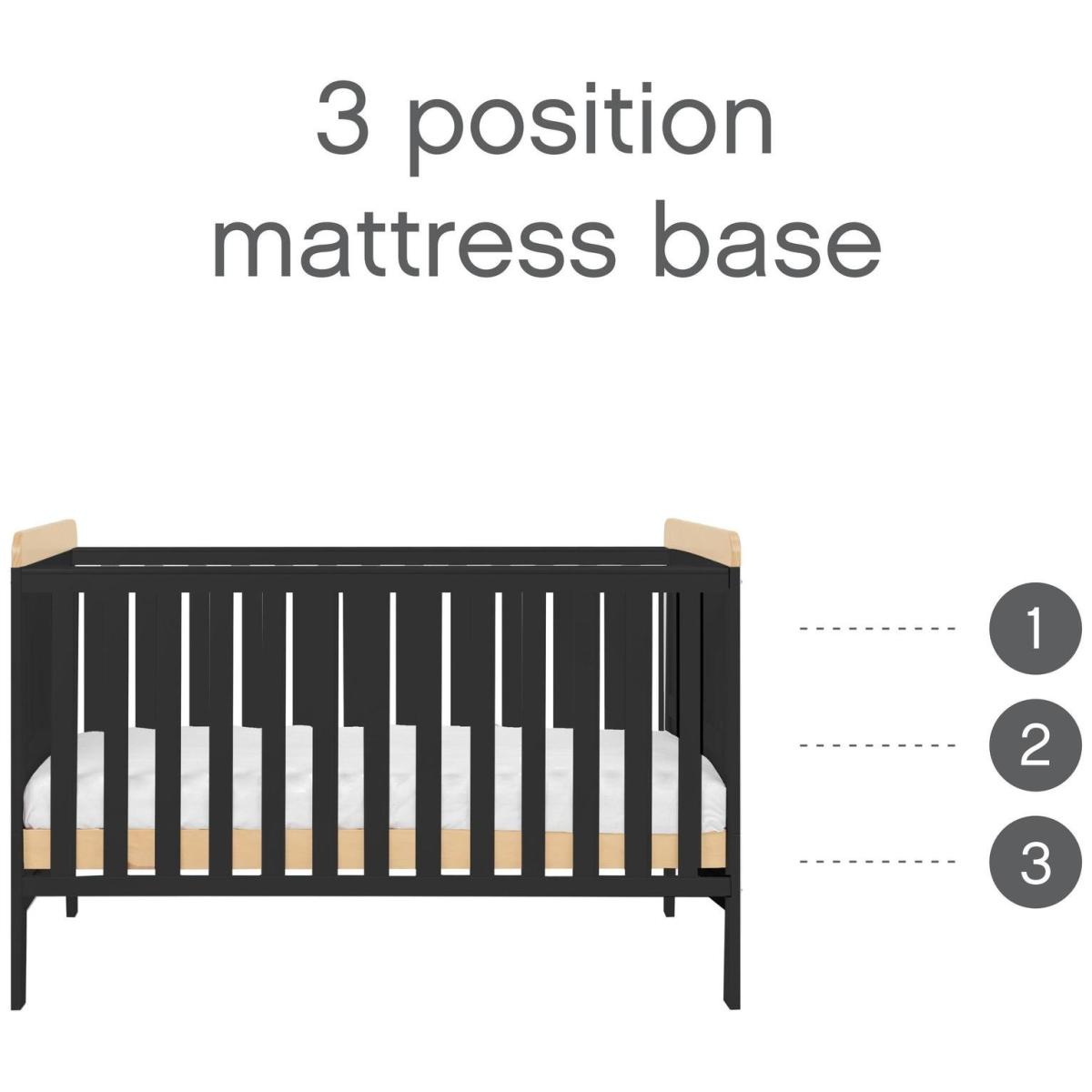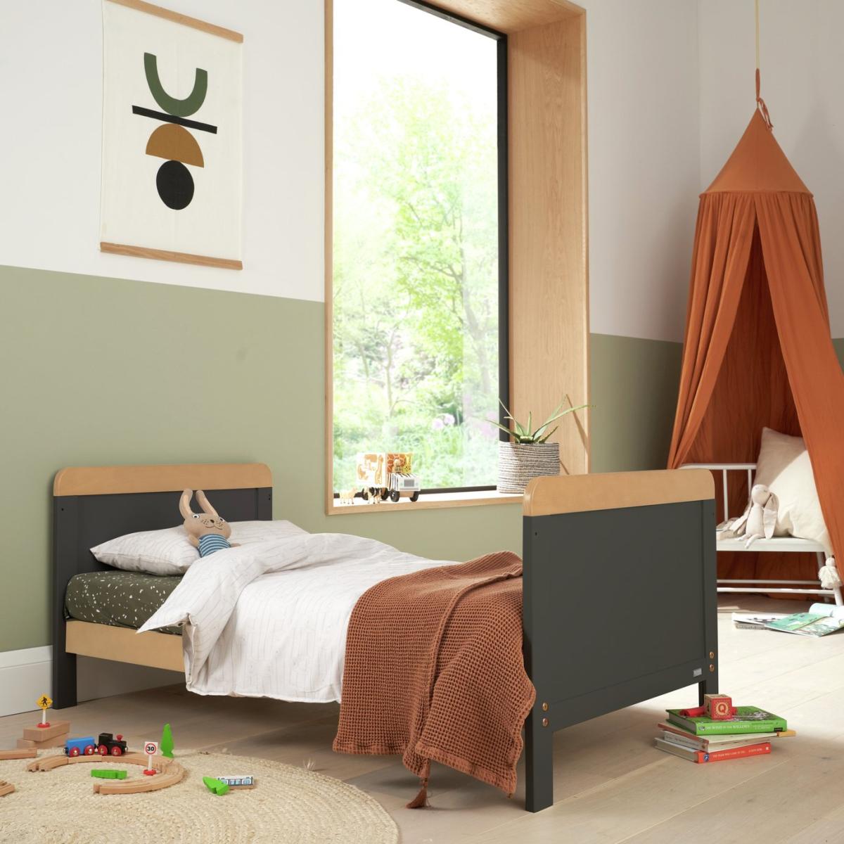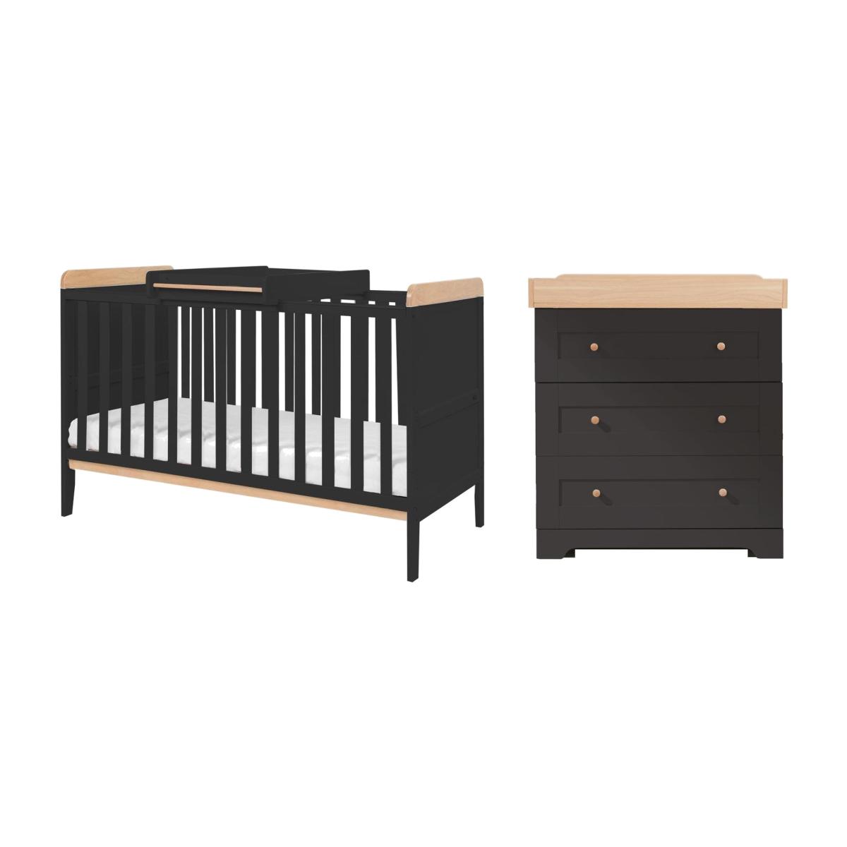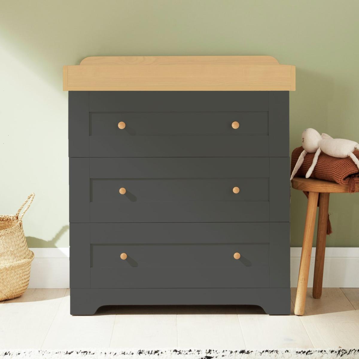 Contemporary and stylish, this Rio nursery furniture set offers affordable comfort, practicality and storage, with a full size Rio cot bed, hand cot top changer and chest of drawers all finished in stunning slate grey and oak. Cot Bed is suitable from birth up to approximately 6 years converting from a cot into a junior bed. Three position mattress height with fixed side rails including two protective teething rails. Cot Top Changer attaches securely on the top of the cot bed to provide comfortable changing facilities. Chest Changer offers three drawers for storing all your baby essentials. Removable Changer Top so you can use for older children. Part of the Rio collection. 2 piece set, including: cot bed, cot top changer, chest of drawers, changing unit, changer top. Made of MDF. Self-assembly. If the product is over 60cm high it must be securely attached to the wall to prevent overturning. - 2 people recommended. Winner of Project Baby Silver. Month and overto 6 years. Cot features Cot L144.2, W87.1, H95cm. Weight 22kg. Mattress base adjustable height 22.9cm, 35.7cm, 48.5cm. Mattress not included. Mattress required: L140, W70, D10cm. Teething rails. Cot suitable from birth until baby is able to climb out. Converts to toddler bed. Toddler bed suitable for ages 12 months to 6 years. Cot bed maximum user weight 100kg. Height under cot 14.9cm. Chest of drawers features Drawers H88, W79, D50cm. Weight 33.3kg. 3 drawers. Chest of drawers internal drawer H12, W66, D37cm. Changer features Changer top internal H7, W76.5, D46cm. Weight 3kg. Changer maximum user weight 15kg. Changer top attached. Changer top detachable. Changer H88, W79, D50cm. Package Dimensions: Package 1 dimensions: H148.5, W86, D14.5cm. Package 1 weight: 29.5kg. Package 2 dimensions: H87, W54, D11cm. Package 2 weight: 20.1kg. Package 3 dimensions: H80, W52, D9cm. Package 3 weight: 21.2kg.