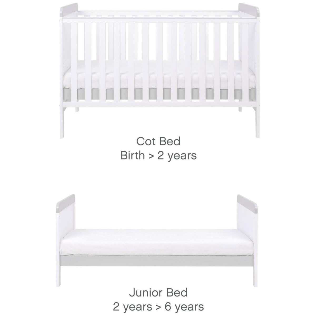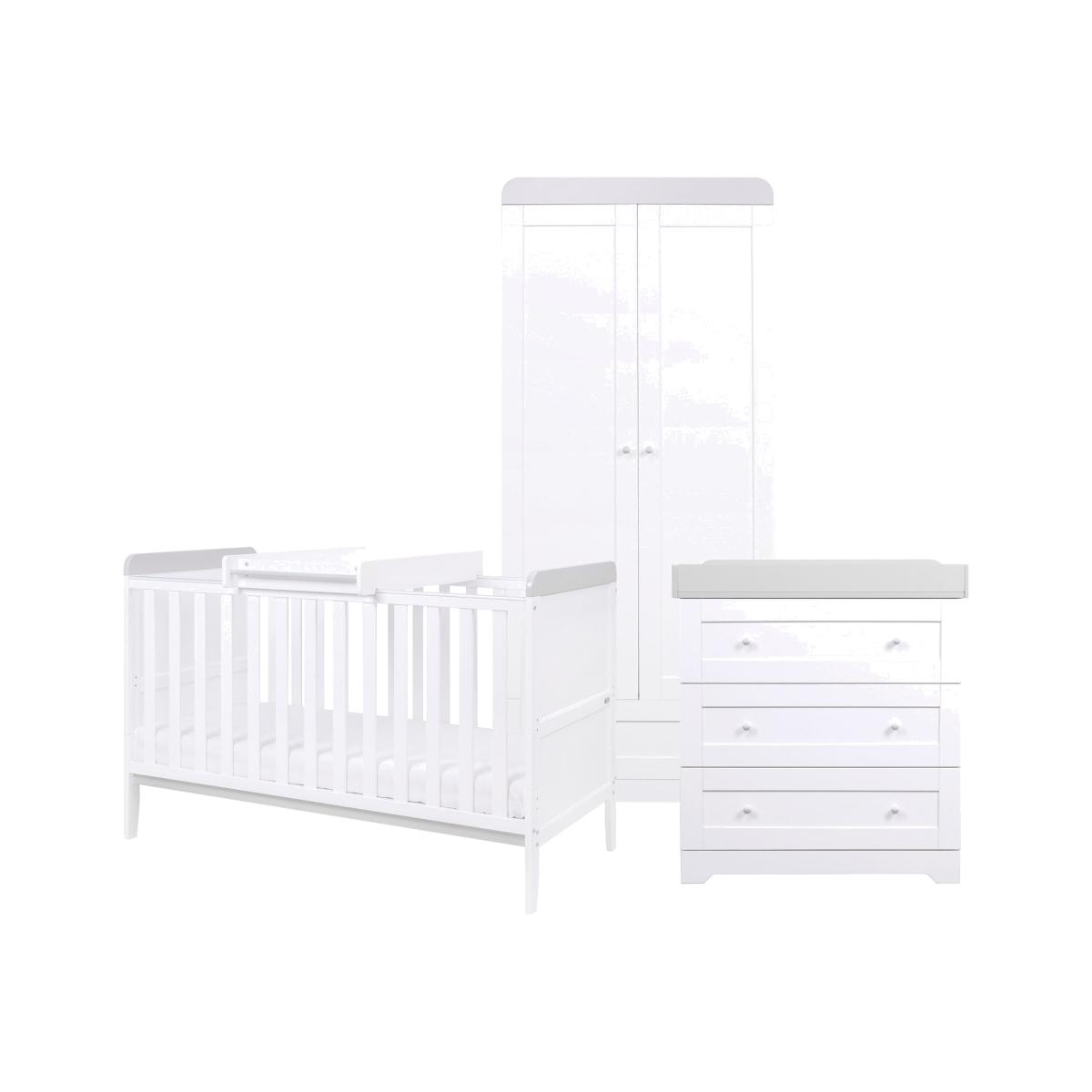 The Rio nursery furniture set offers contemporary style in fresh white and grey, along with plenty of affordable storage. This set includes a full size Rio cot bed, handy cot top changer, nursery chest of drawers and wardrobe. Our Rio nursery collection is available as standalone pieces, or you can shop the full look and buy a three-piece room set. Our Rio nursery furniture range has plenty of storage space built in. Our chest changing units have three generously sized drawers and our wardrobes have plenty of hanging space as well as shelving and a full width drawer. Don't forget you can store items on top of your wardrobe too. Part of the Rio collection. 4 piece set, including: cot bed, cot top changer, wardrobe, chest of drawers, changing unit, changer top. Made of MDF. Packed flat. If the product is over 60cm high it must be securely attached to the wall to prevent overturning. - 2 people recommended. Suitable from birth months and overto 4 years. Cot features Cot L144.2, W87.1, H95cm. Weight 22kg. 3 position adjustable mattress to lower the baby as they grow. Mattress base adjustable height 22.9cm, 35.7cm, 48.5cm. Mattress not included. Mattress required: L140, W70, D10cm. Teething rails. Cot suitable from birth until baby is able to climb out. Converts to toddler bed. Toddler bed suitable for ages 12 months to 4 years. Cot bed maximum user weight 100kg. Height under cot 14.9cm. Dresser features Dresser H88, W79, D50cm. 1 drawer. Wardrobe features Wardrobe H175, W75, D48cm. Weight 47.4kg. 2 doors. 1 hanging rail. Hanging rail weight capacity 15kg. 1 fixed shelf. Wardrobe internal drawer H12, W66, D37cm. Chest of drawers features Drawers H88, W79, D50cm. Weight 33.3kg. 3 drawers. Chest of drawers internal drawer H12, W66, D37cm. Changer features Changer top internal H10, W76.5, D46cm. Weight 3kg. Changer maximum user weight 15kg. Changer top attached. Changer top detachable. Changer H87.1, W49, D10cm. Packaging Comes in 3 boxes. Largest box H179, W86, D14.5cm. Package Dimensions: Package 1 dimensions: H148.5, W86, D14.5cm. Package 1 weight: 29.5kg. Package 2 dimensions:H88.5, W55, D13.5cm. Package 2 weight: 29.6kg. Package 3 dimensions: H179, W58, D12.5cm. Package 3 weight: 29.6kg.