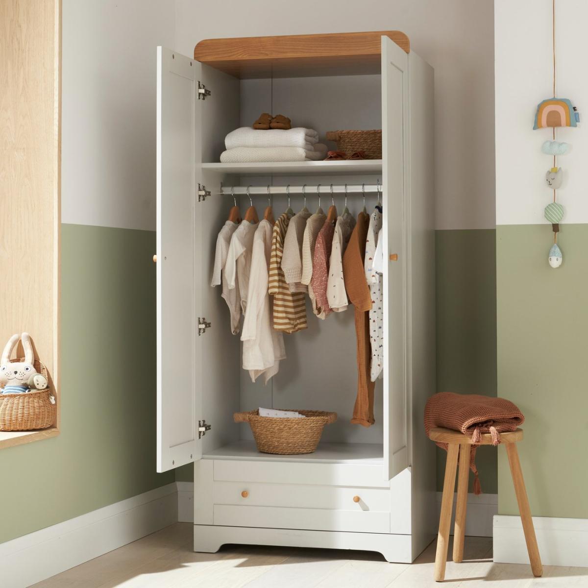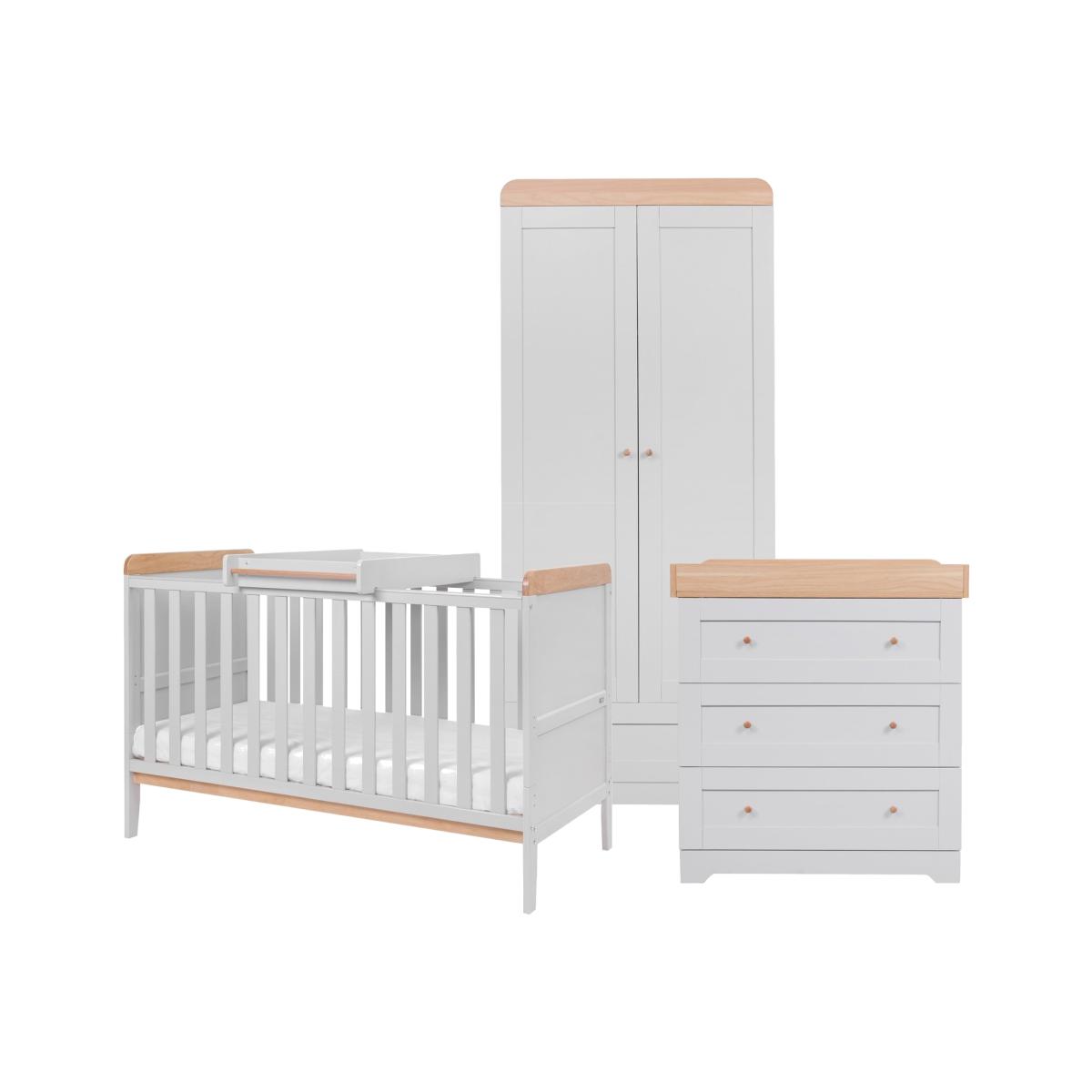 The Rio 3pc Room Set from Tutti Bambini offers a contemporary look with plenty of storage in an affordable package. Cot Bed is suitable from birth up to 6 years (approx. ) converting from a cot into a junior bed with 3 position mattress heights and fixed side rails including teething rails. The practical Chest Changer offers 3 drawers for storing all your baby essentials and the Rio Wardrobe features a full width drawer and hanging rail plus a handy shelf so plenty of storage space. Part of the Rio collection. 3 piece set, including: cot, cot top changer, wardrobe, chest of drawers,. Made of wood. Self-assembly. If the product is over 60cm high it must be securely attached to the wall to prevent overturning. - 2 people recommended. Suitable from birth month and overto 6 year. Cot features Cot L144.2, W87.1, H95cm. Weight 25kg. 3 position adjustable mattress to lower the baby as they grow. Mattress base adjustable height 22.9cm, 35.7cm, 48.5cm. Mattress not included. Mattress required: L140, W70, D7cm. Teething rails. Cot suitable from birth until baby is able to climb out. Converts to toddler bed. Toddler bed suitable for ages 1 year to 6 year. Cot bed maximum user weight 100kg. Height under cot 14.9cm. Wardrobe features Wardrobe H175, W75.2, D48.2cm. Weight 47.4kg. 2 doors. 1 hanging rail. Hanging rail weight capacity 15kg. 1 fixed shelf. Wardrobe internal drawer H12, W66, D37cm. Chest of drawers features Drawers H88, W78.6, D50cm. Weight 33.3kg. 3 drawers. Chest of drawers internal drawer H12, W66, D37cm. Changer features Changer top internal H8, W78, D50cm. Weight 7.5kg. Changer maximum user weight 15kg. Changer top detachable. Changer H88, W78.6, D50cm.