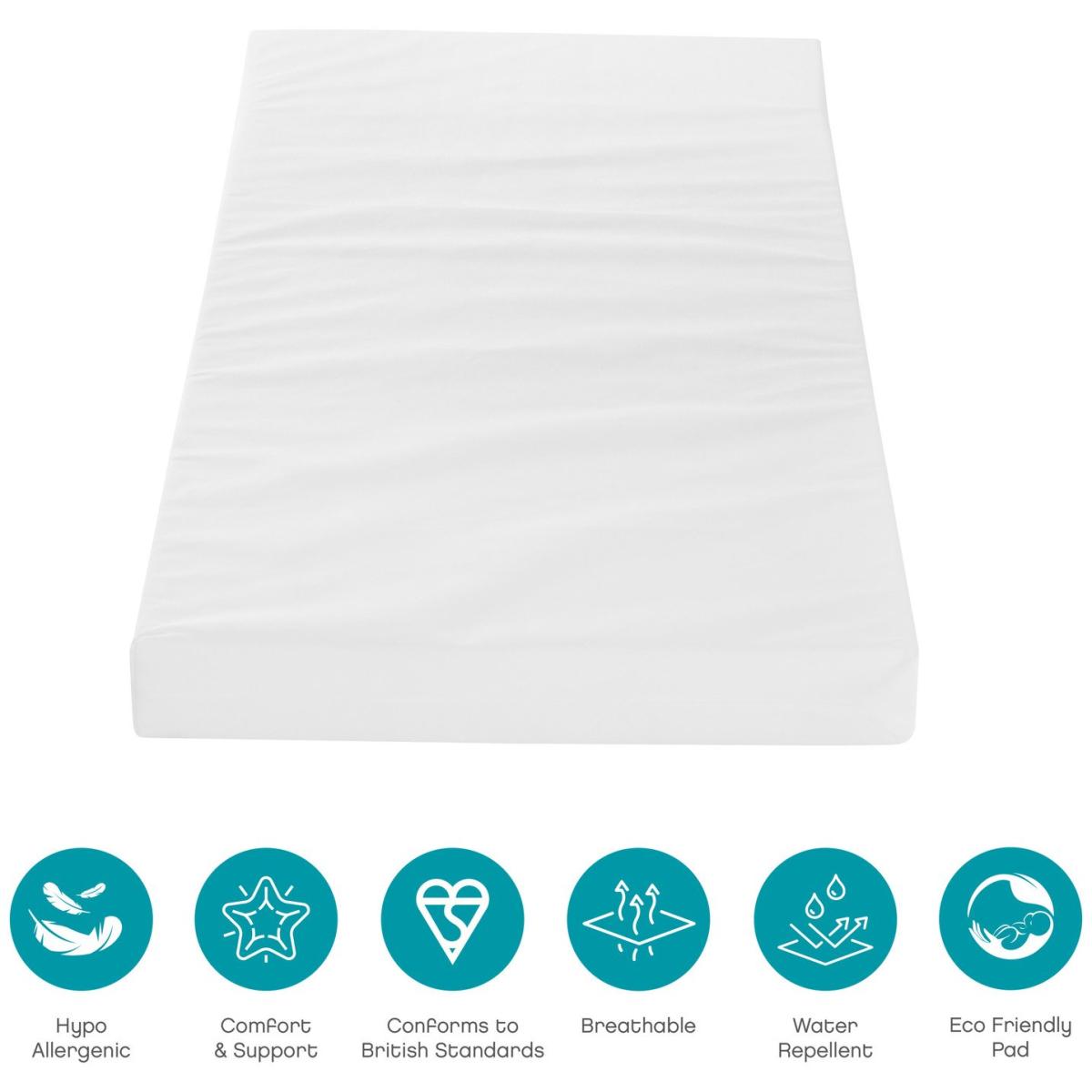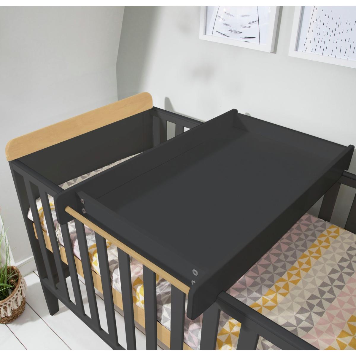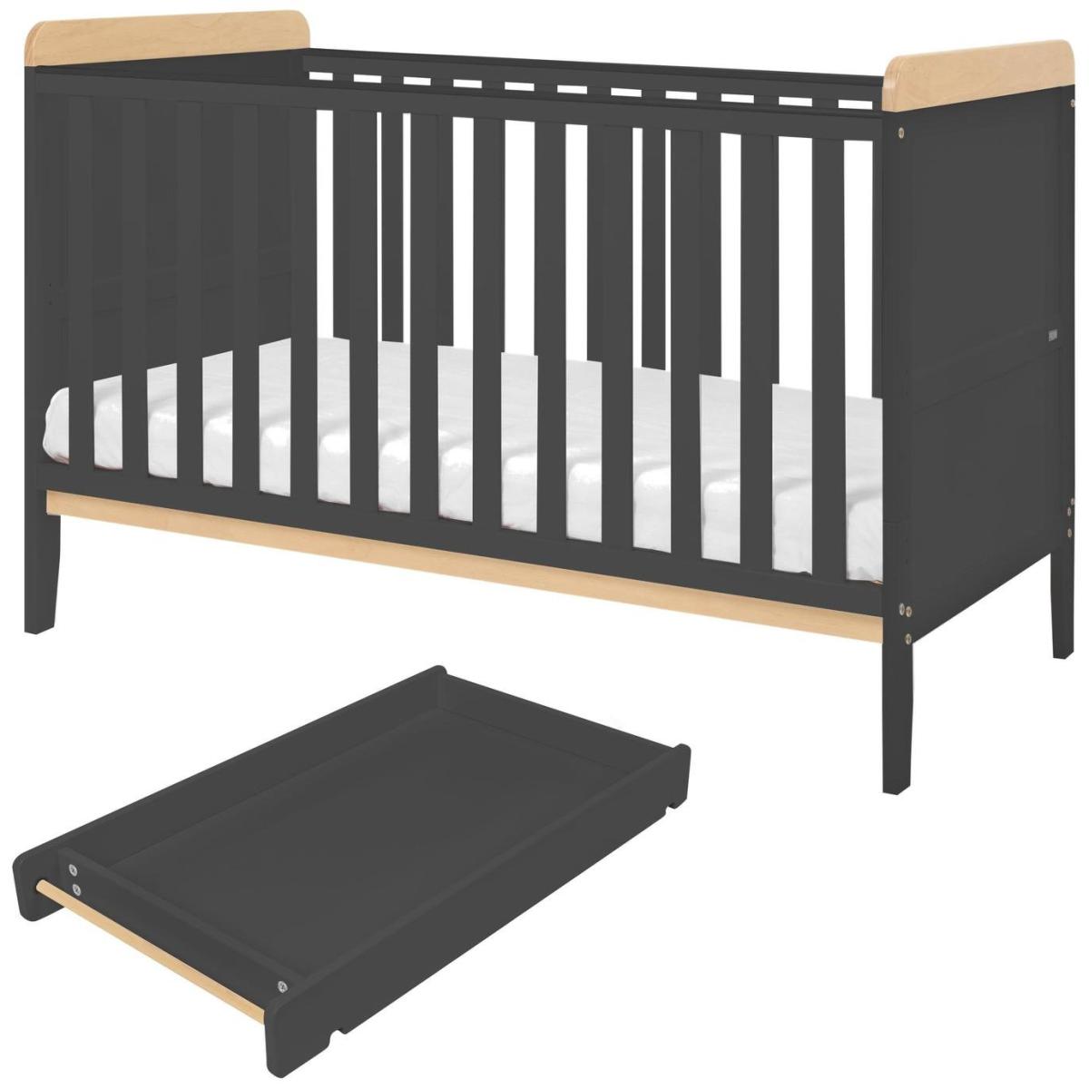 A contemporary cot bed complete with matching cot top changer and mattress. The slate grey and oak Rio cot bed holds all your nursery essentials in one stylish, affordable package. Part of the Rio collection. Suitable from birth to 5 years and over. Suitable for babies up to 100kg. Winner of Winner of Project Baby Silver Award. Made from MDF. Packed flat. Cot Features Size L144.2, W87.1, H95cm. Weight 22kg. Teething rails - protects your baby's gums once they are teething and have started to chew. 3 position adjustable mattress base - allows you to lower the height of the mattress as your baby learns to sit and stand. Mattress base adjustable height 48.5cm, 35.7cm, 22.9cm. Height under cot 14.9cm. Cot suitable from birth until baby is able to climb out. Converts to toddler bed. Mattress Features Mattress size L140, W70, D8cm. Mattress included. Hypoallergenic. Removable washable cover. Changer Features Changer top included. Changer top detachable. Changer top internal H7,W46,D87.1cm. Changer maximum user weight 15kg.
