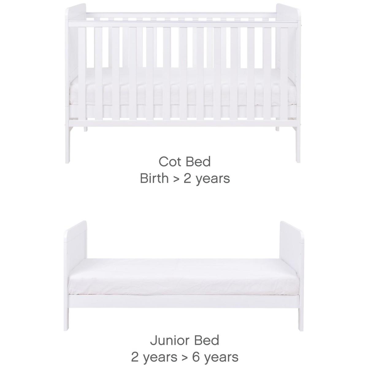 The Rio Cot Bed from Tutti Bambini includes a handy, space saving cot top changer and a hypoallergenic, breathable fibre mattress. Suitable for use from birth with a three position mattress height, once your little one is ready for their big bed, the Rio easily converts into a junior bed that can be used up to 4 years old approx. The Rio will give a contemporary feel to any nursery with its pure white painted finish and offers exceptional quality for a great value price. Made from: Engineered wood and New Zealand Pine. Top changer suitable from birth to 10 kg (approx. 1 year)Rio mattress suitable from birth and complies with all current British and European safety standards. Suitable for cot beds and toddler beds. Hypoallergenic. Anti-allergenic. Healthguard anti-allergy fibre mattress. Core material polyester. Cover: 100% polypropylene,. Removable washable cover. General information: Size L140, W70, D7cm. Manufacturer's 3 year when registering online guarantee.