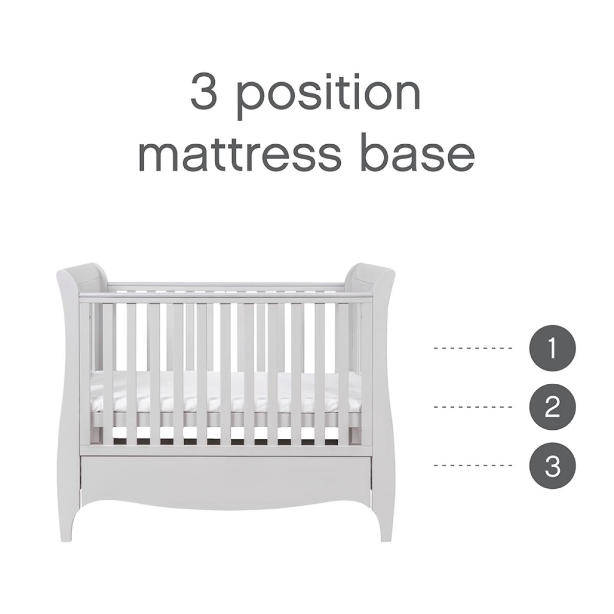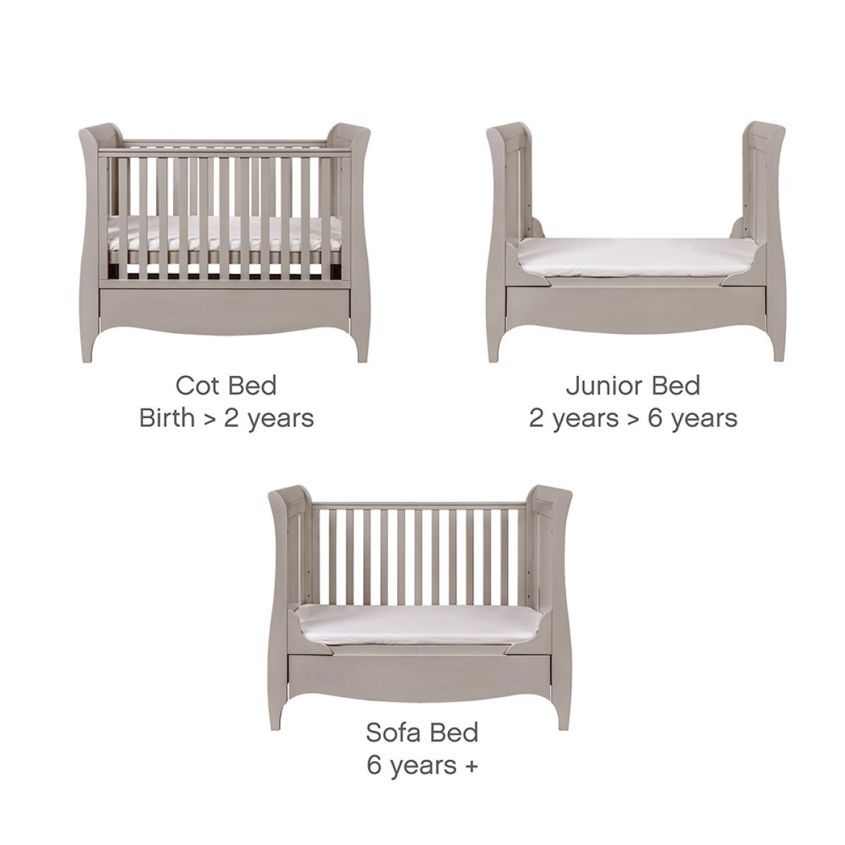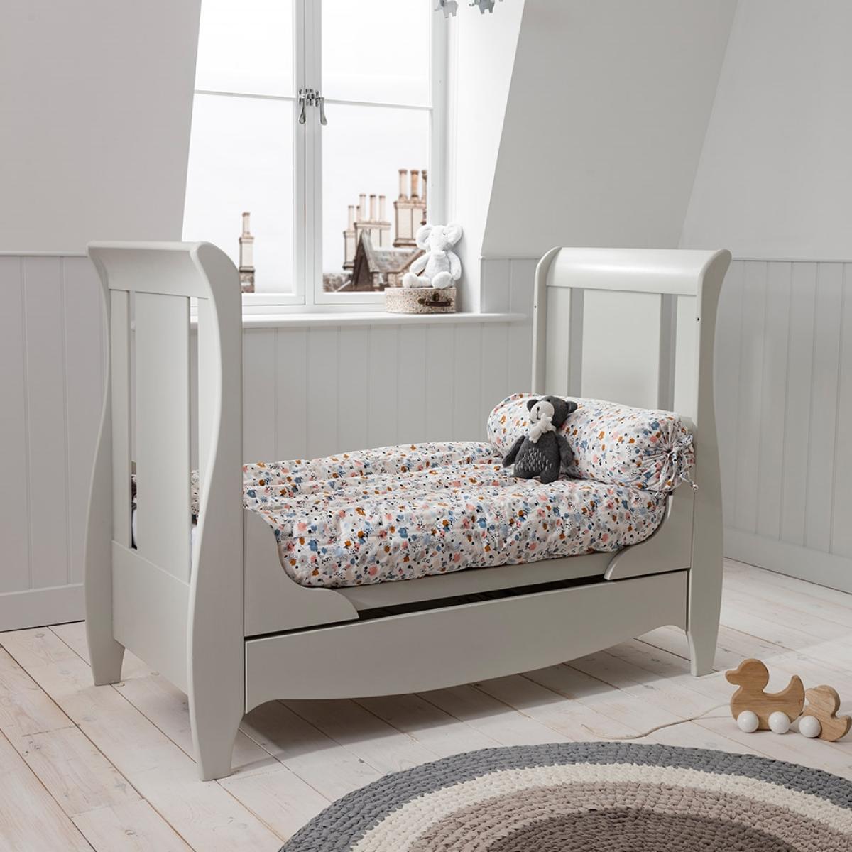 From birth to 4 years, the Roma Mini Sleigh Cot Bed with Under Bed Drawer from Tutti Bambini will transform as your little one grows! With 3 mattress positions available, you'll rest easy knowing they'll be safe and secure at all times. Once outgrown from the cot, rearrange into a toddlers bed or the perfect daybed for night-time reads, simply adjust the frame to suit the needs of your tiny tot. Including a large under-bed drawer, store all essentials; bedding, comforters and toys and enjoy a mess-free bedroom. Not for long though once they find their feet! With all 3 colourways being neutral, however you decorate the nursery this mini cot bed is sure to fit in beautifully, ready for you to welcome home the new arrival of your beautiful baby!.