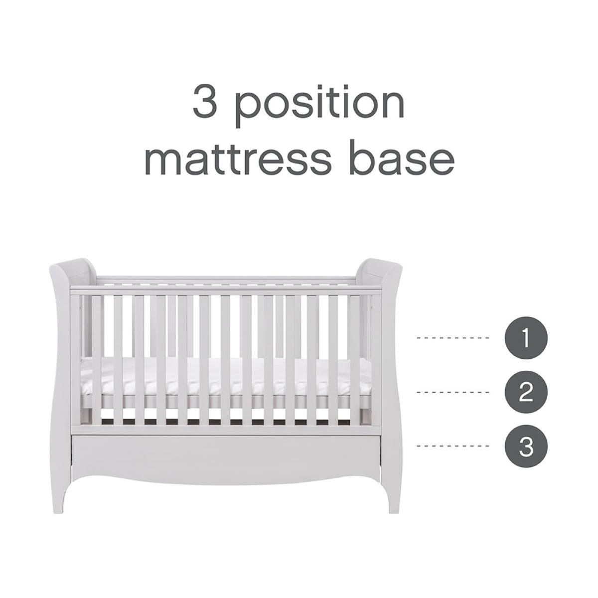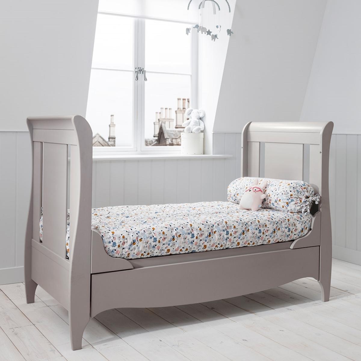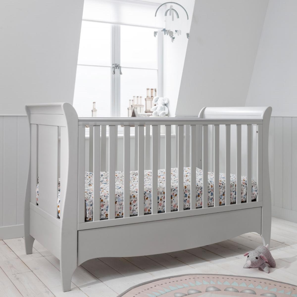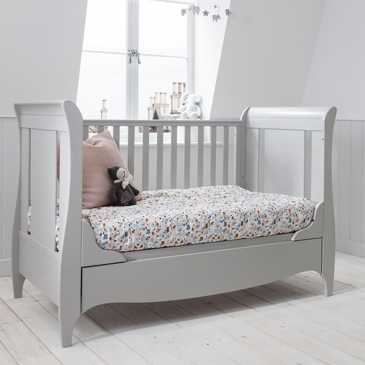 The Tutti Bambini Roma Sleigh Cot Bed with Under Bed Drawer will be the perfect addition for your little one's nursery! Adjustable and adapting to their needs up to the age of 5 years, you'll be able to rest easy knowing they will be safe and secure due to the 3 position mattress base and high rails. And when they have finally outgrown the cot, convert it into a toddler bed, a sense of familiarity will ensure their bedtime routine isn't disturbed… they'll still be sleeping blissfully! Or you can transform it into a little daybed and create a reading hideaway for them to settle down before bedtime calls! Adjusting to suit the needs of your tiny tot, you'll all be happy with however it's used. With an under bed drawer attached, fill with spare bedding and all essentials needed! All 3 colourways are neutral so whether it's a boy or a girl this cot bed will suit any little bundle of joy. Let the exciting adventure commence!.