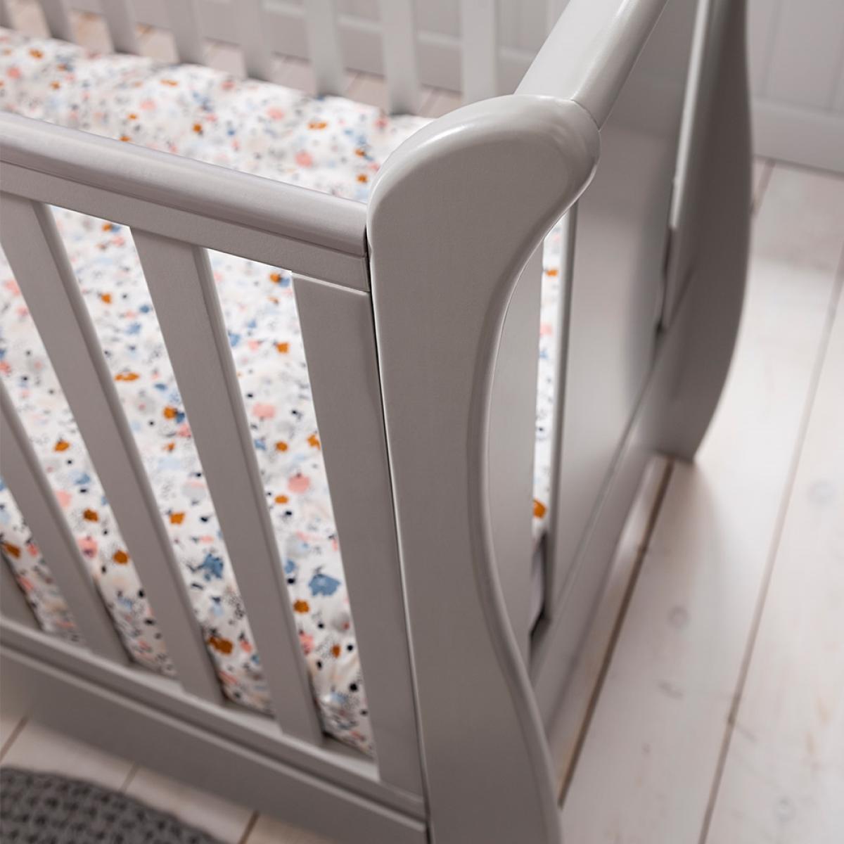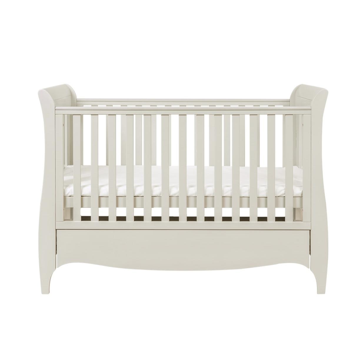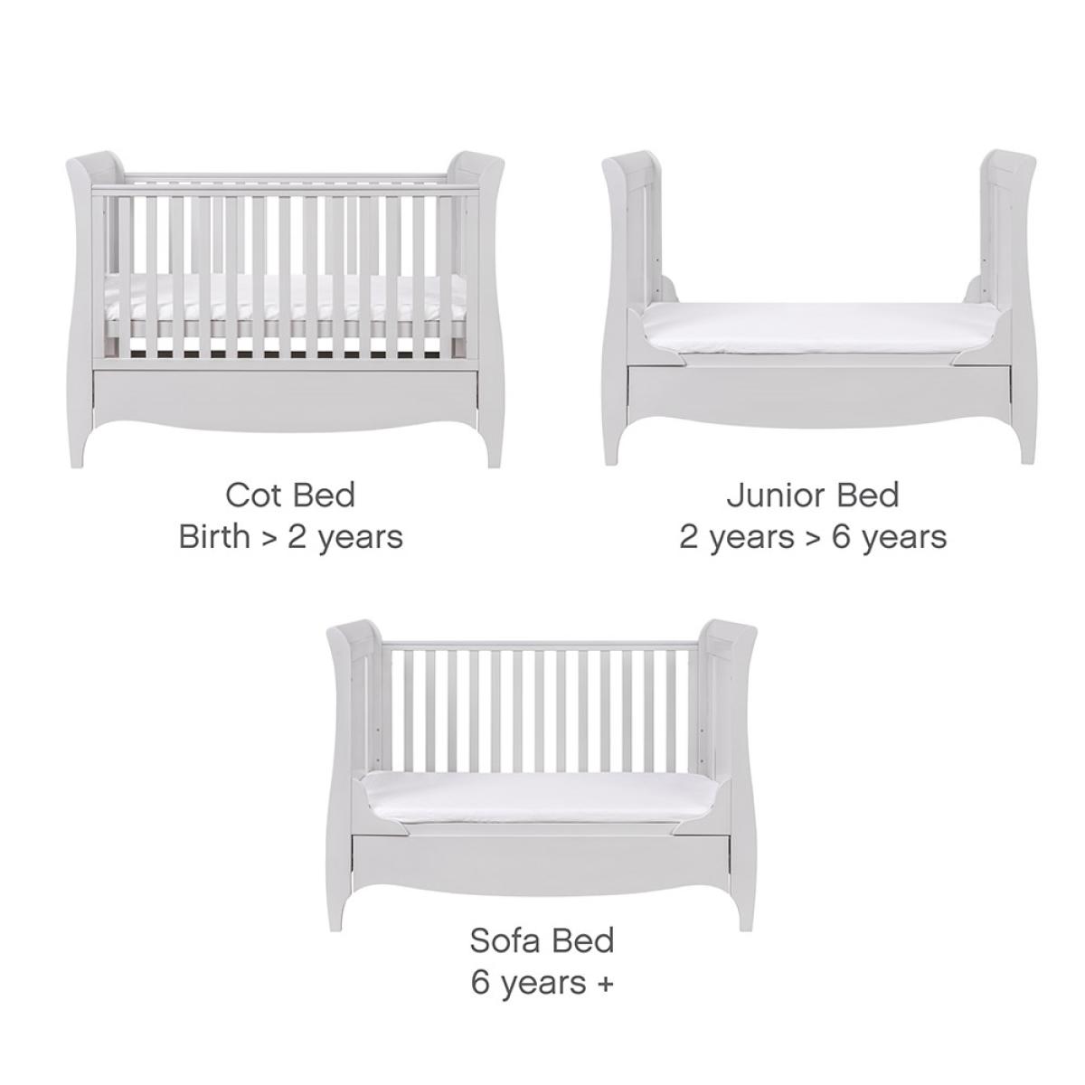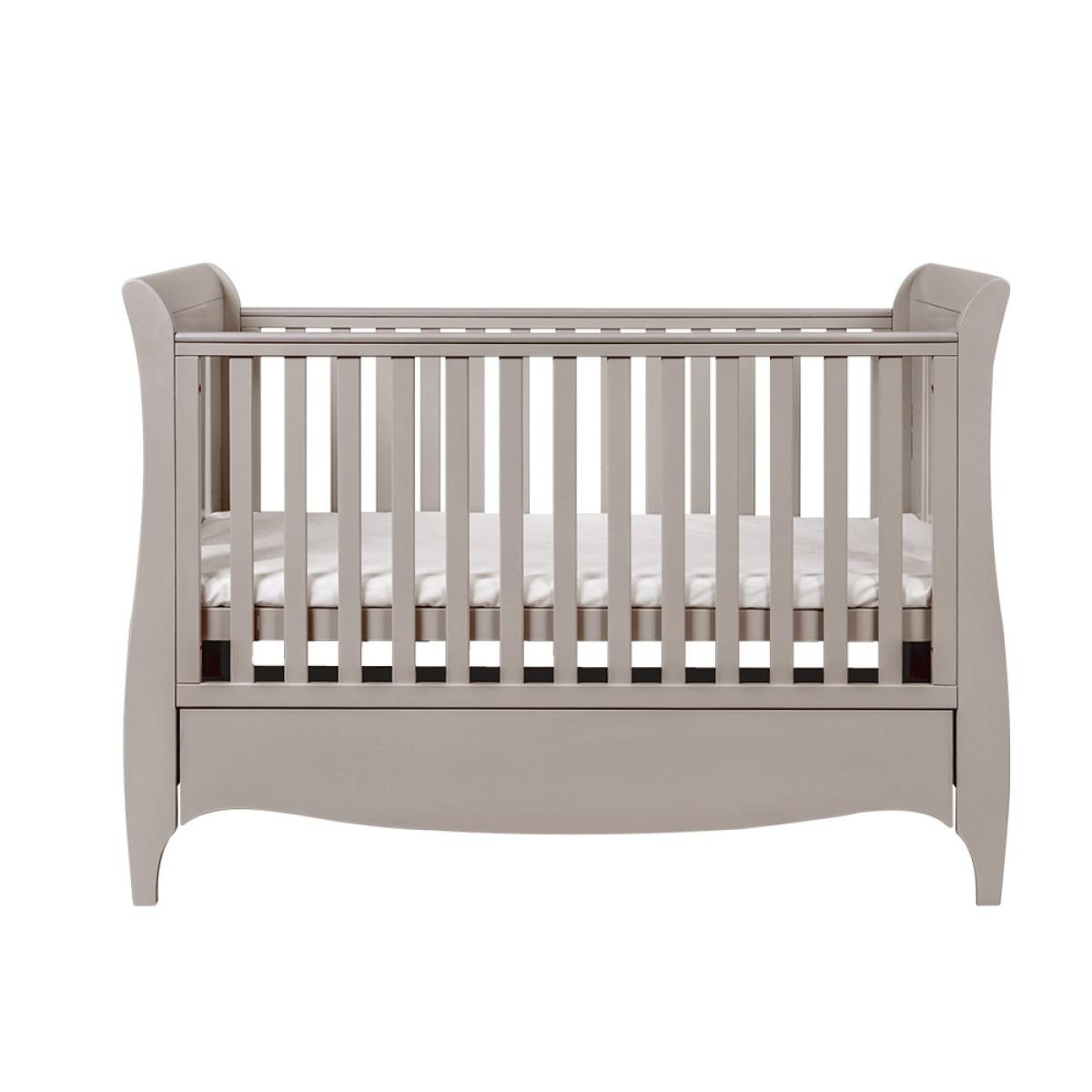The Tutti Bambini Roma Sleigh Cot Bed with Under Bed Drawer will be the perfect addition for your little one's nursery! Adjustable and adapting to their needs up to the age of 5 years, you'll be able to rest easy knowing they will be safe and secure due to the 3 position mattress base and high rails. And when they have finally outgrown the cot, convert it into a toddler bed, a sense of familiarity will ensure their bedtime routine isn't disturbed… they'll still be sleeping blissfully! Or you can transform it into a little daybed and create a reading hideaway for them to settle down before bedtime calls! Adjusting to suit the needs of your tiny tot, you'll all be happy with however it's used. With an under bed drawer attached, fill with spare bedding and all essentials needed! All 3 colourways are neutral so whether it's a boy or a girl this cot bed will suit any little bundle of joy. Let the exciting adventure commence!.