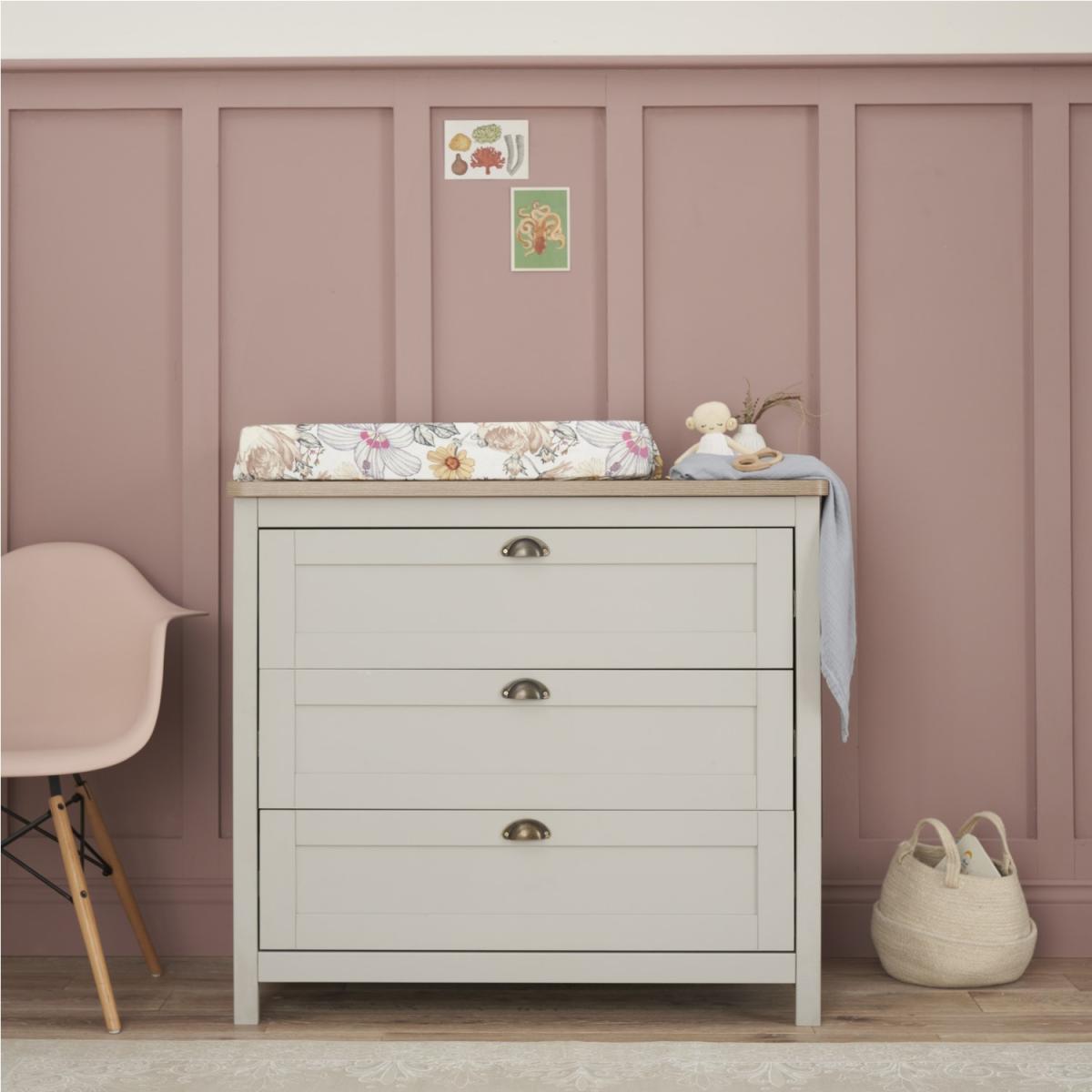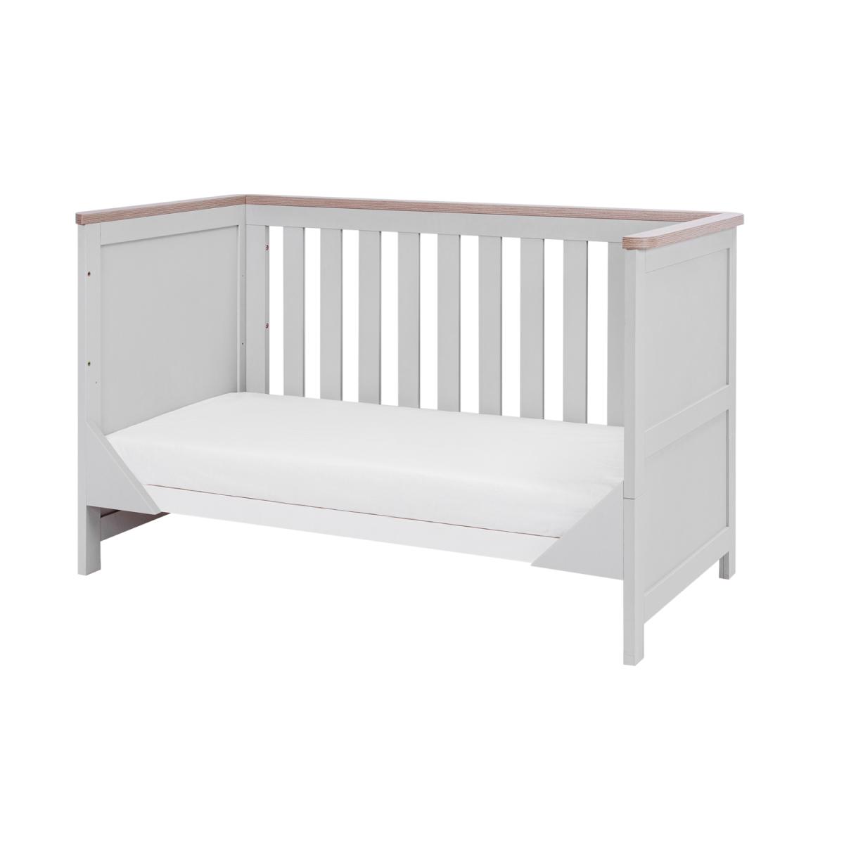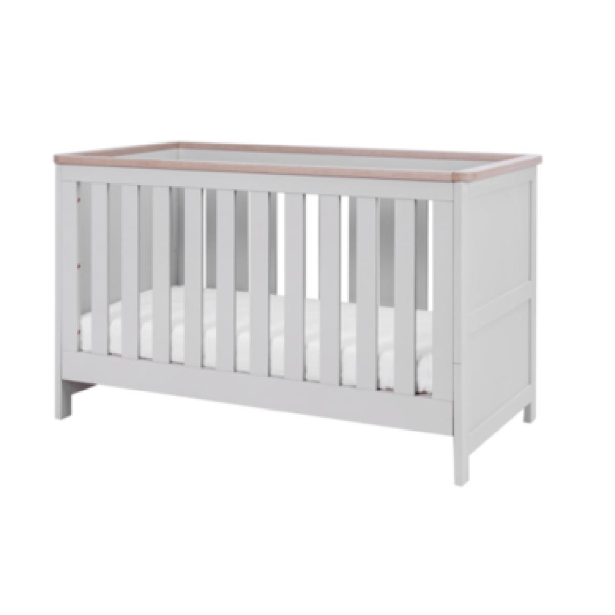 Dimensions cot bed H85 x W75.6 x D150.5 cm. changer/chest H90.7 x W55 x D100cm Features. Verona two piece nursery furniture set. Includes cot bed and chest changer. Fully removable changing top. Suitable for years to come Designed with clean lines and finished in dove grey and oak the Verona two piece nursery furniture set promises a beautiful traditional look for your nursery. The shaker style chest changer features a fully removable changing top and the matching cot bed converts to junior bed and day bed making this nursery set suitable for years to come .
