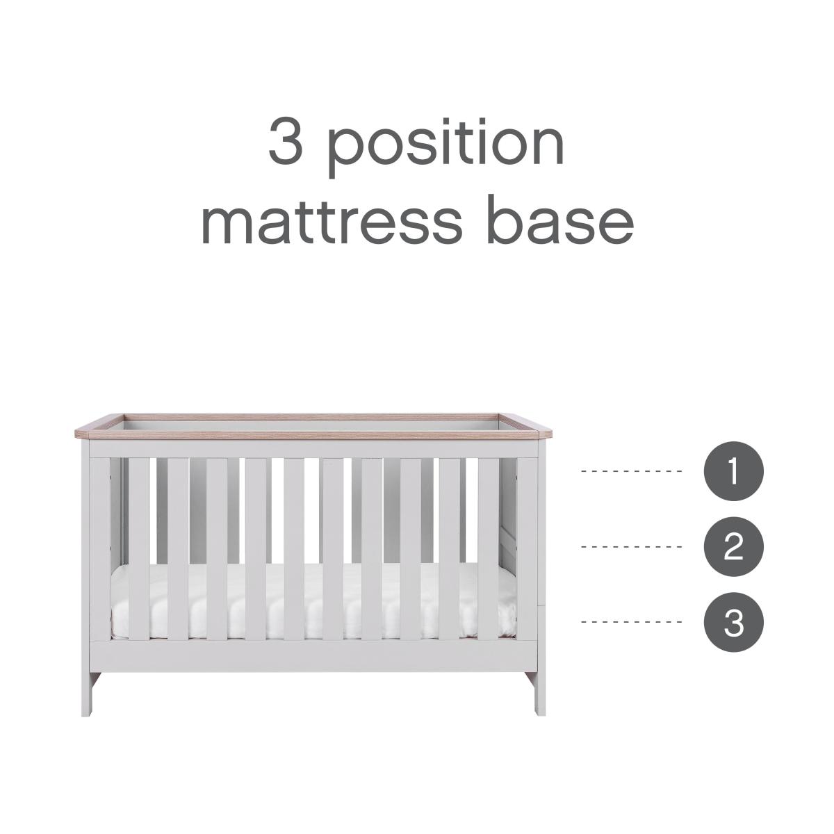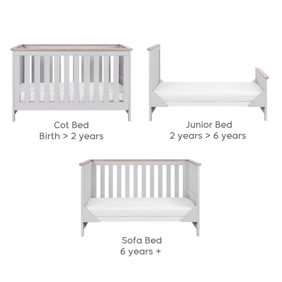 * Convertible from a cot bed to a toddler bed and sofa, this cotbed is designed to grow with your child* Adjustable 3 position mattress base to give the best access to your child whatever their age* These cotbeds are suitable for use from birth right up to 6 years of age * Includes everything you need to convert them into a stylish junior bed and sofa. * Matching furniture and accessories available to complete the look. * Tutti Bambini 3 Year Guarantee available. Designed to evolve with your child, this cot bed converts from a cot to a toddler bed and sofa. With an adjustable 3-position mattress base, it provides the best access for your child as they grow. Suitable for use from birth to 6 years, the set includes all essentials for transforming it into a stylish junior bed and sofa, complemented by matching furniture and accessories, all with the Tutti Bambini 3 Year Guarantee.