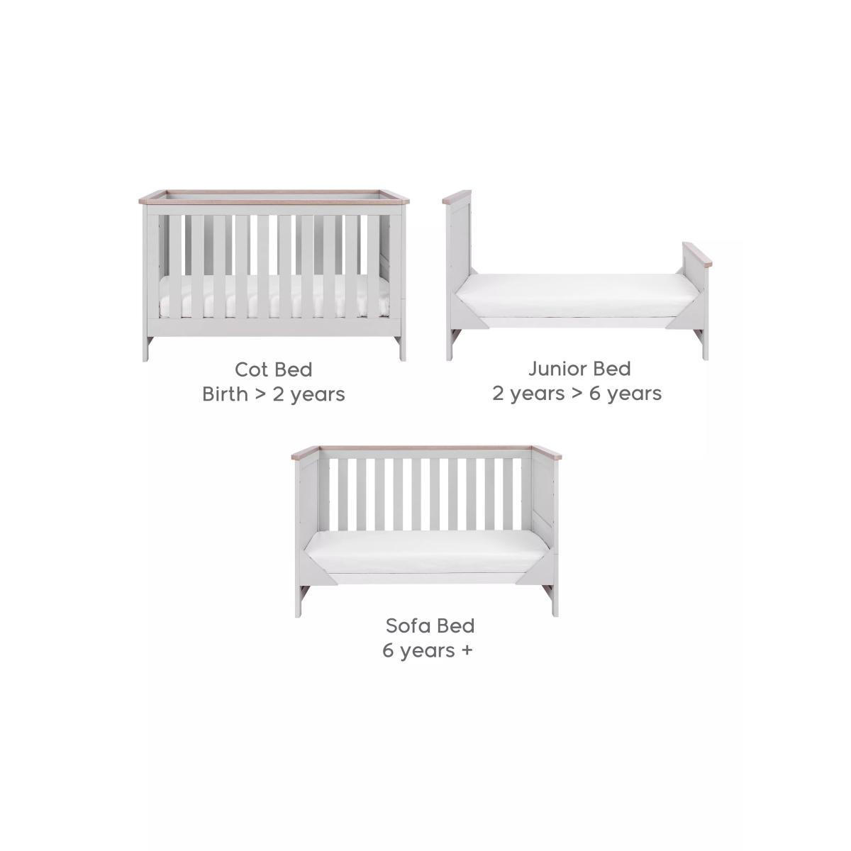 Designed in a beautiful, clean-lined traditional style, the Tutti Bambini Verona Cot Bed is the perfect addition to your nursery. The Verona cot beds have three mattress heights to grow with your little one and also convert to both junior beds and sofa or day beds so that you can use them for longer and don’t have to go to the expense of buying new furniture in those early years. Add in textured fabrics or bold prints to add a contemporary twist to this traditional shaker-inspired cot bed. Matching furniture is also available separately. For this item, our supplier will provide a room of choice delivery service.