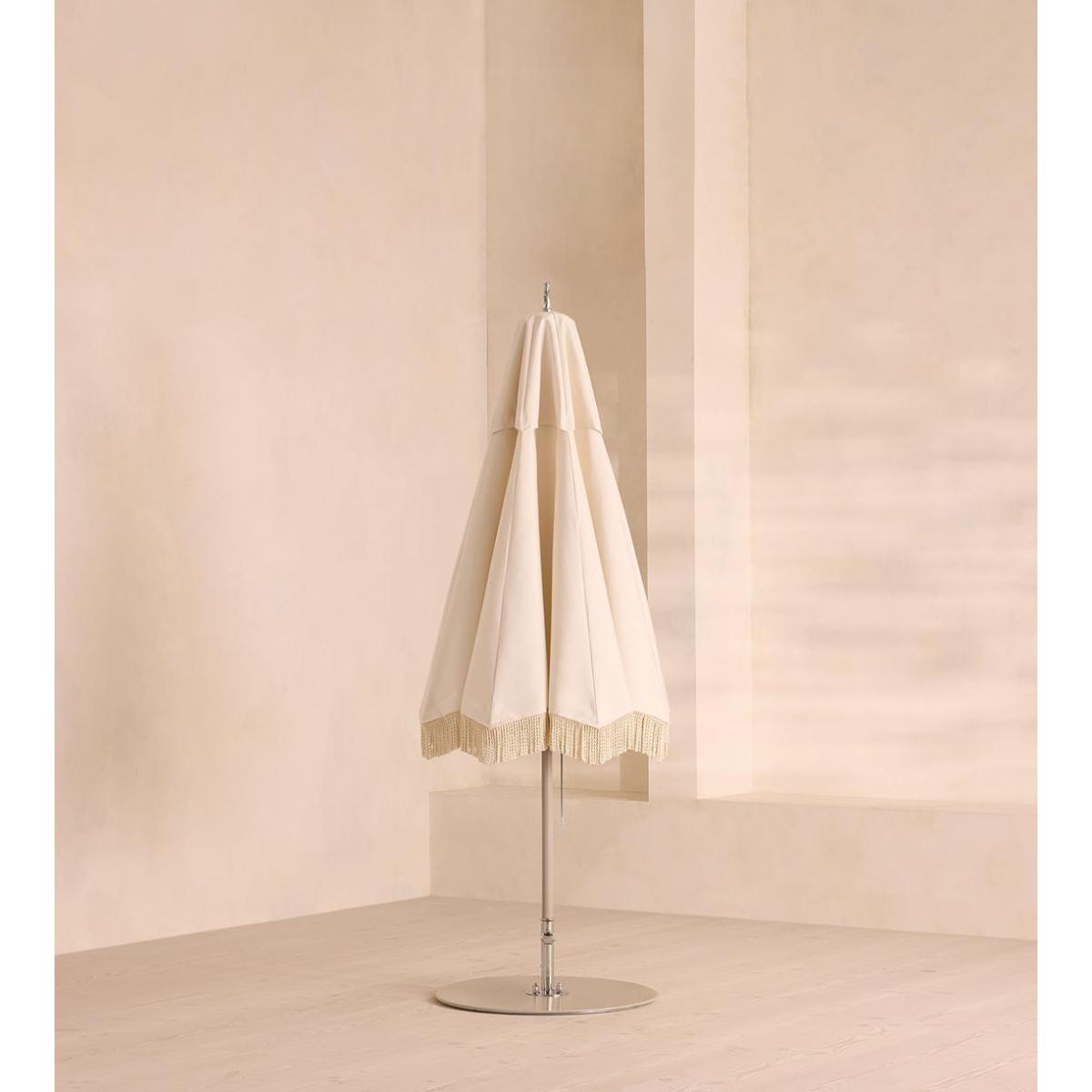 A hardy parasol made using marine-grade materials, designed to emulate the poolside aesthetic in our Houses. A renowned outdoor lifestyle brand, Tuuci provides all of the parasols seen in our Houses. Designed to recreate the poolside experience in your own garden, this cream-coloured style is detailed with tonal fringing around its softly scalloped edge. Innovative engineering with marine-grade materials means it can withstand the harshest environments.