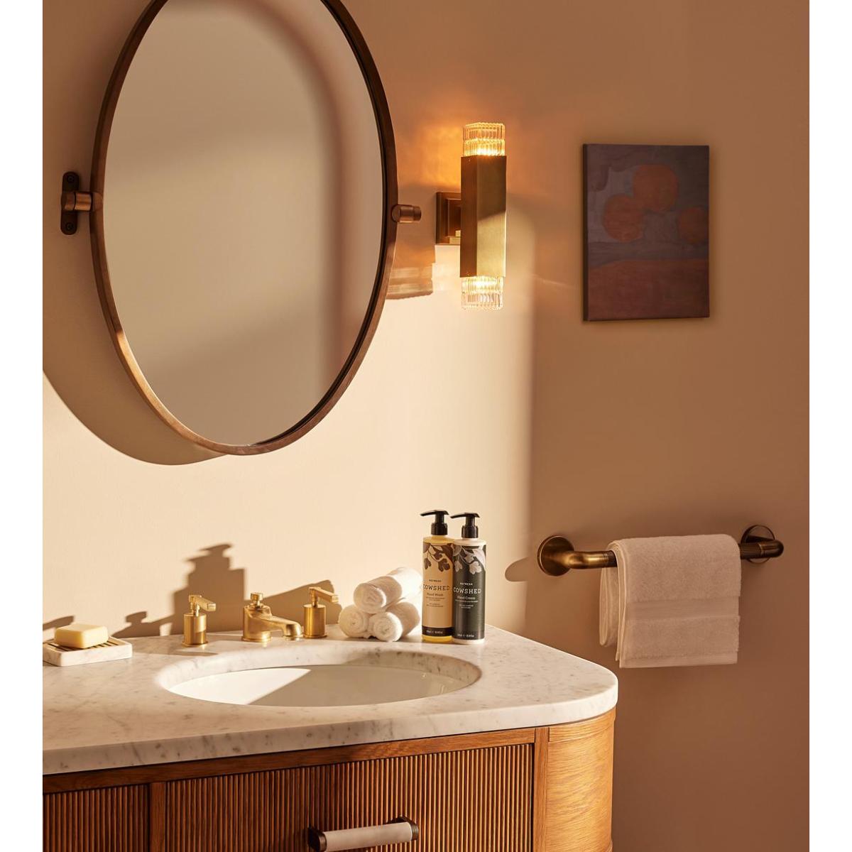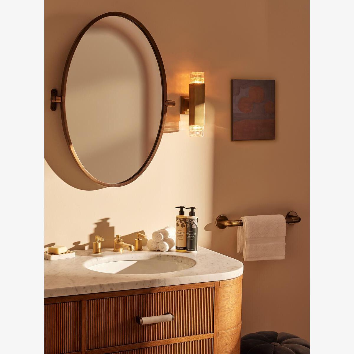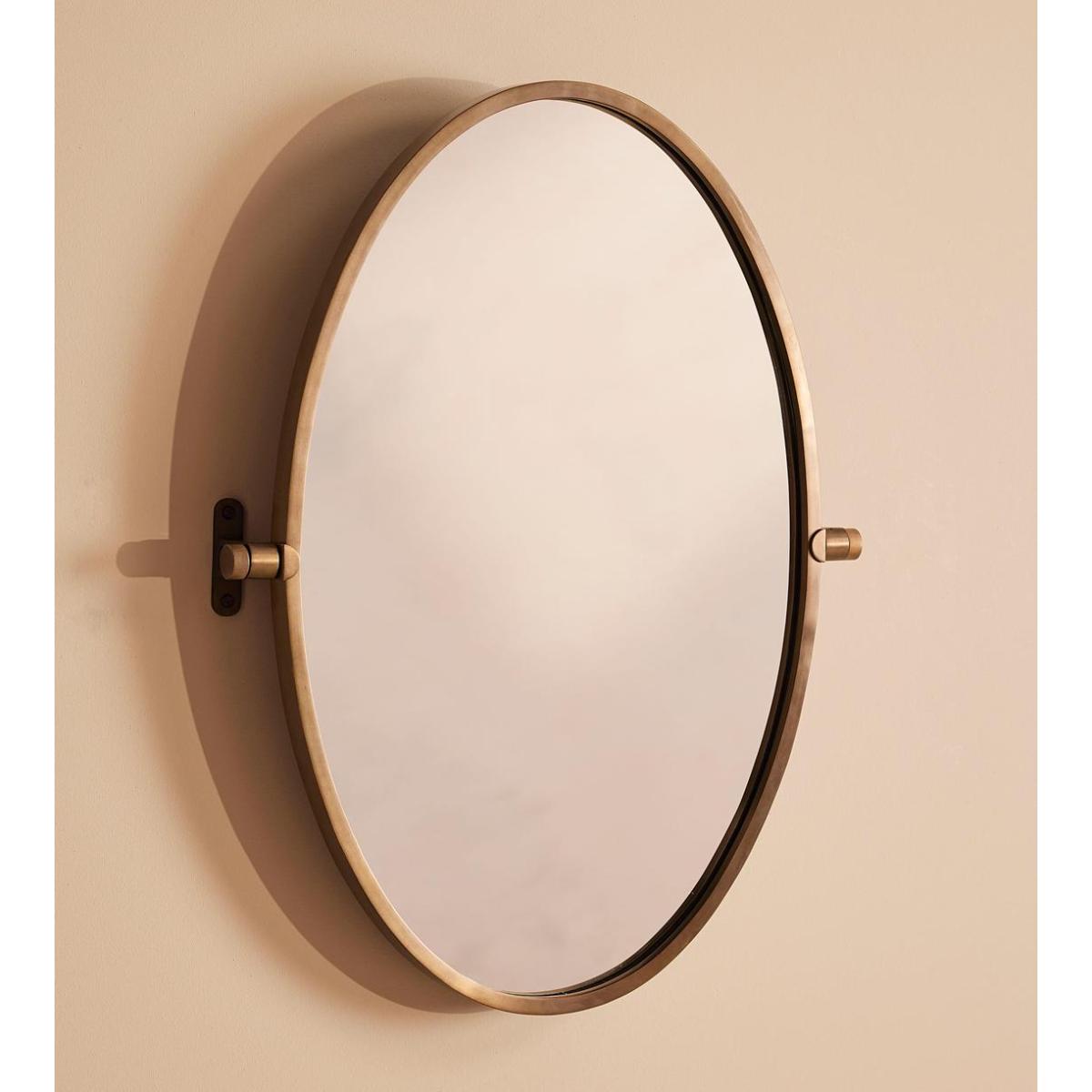 An antiqued finish to the brass lends the Tuxford wall mirror a vintage aesthetic inspired by the interiors of Soho House Rome. Tilt its suspended frame up or down to adjust the angle.