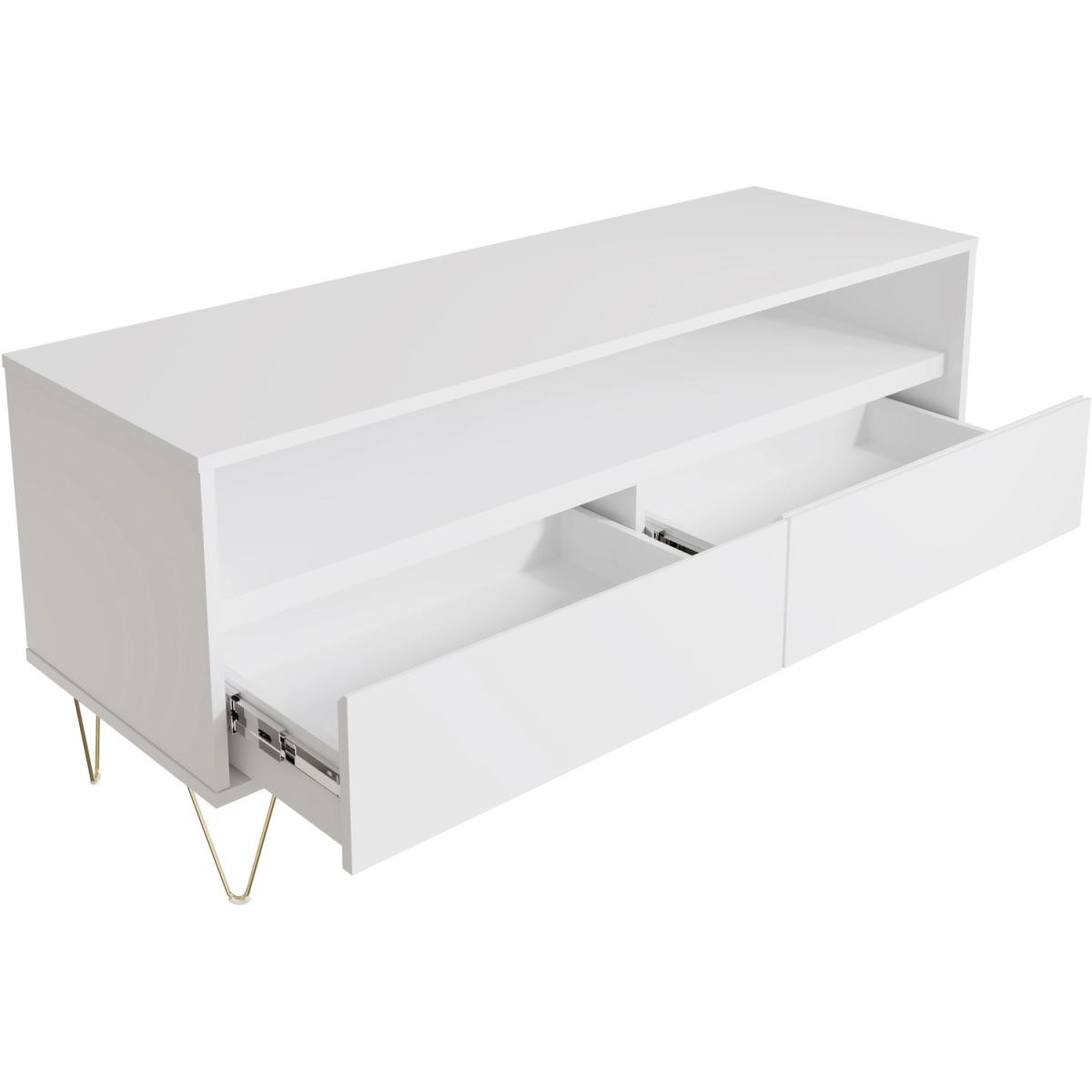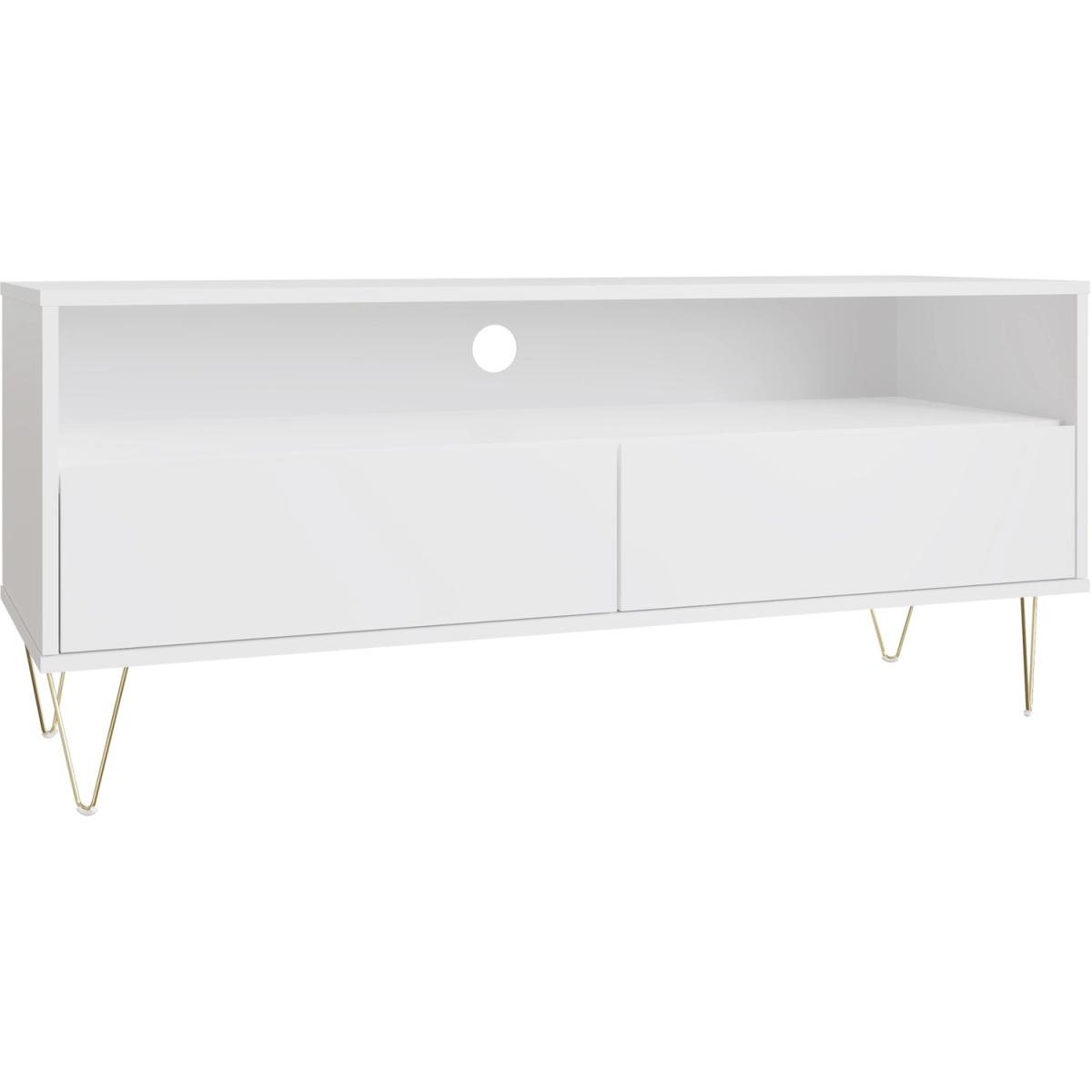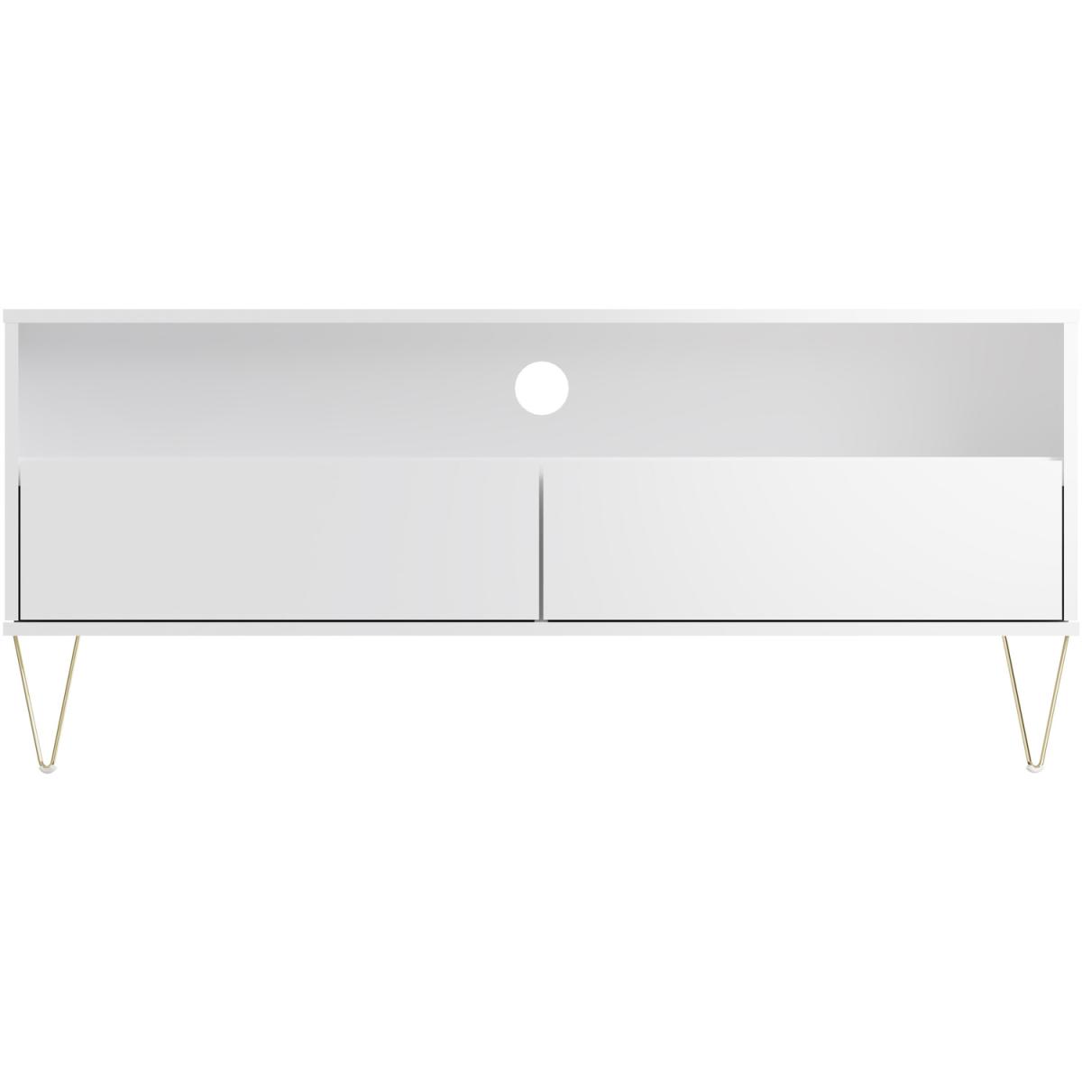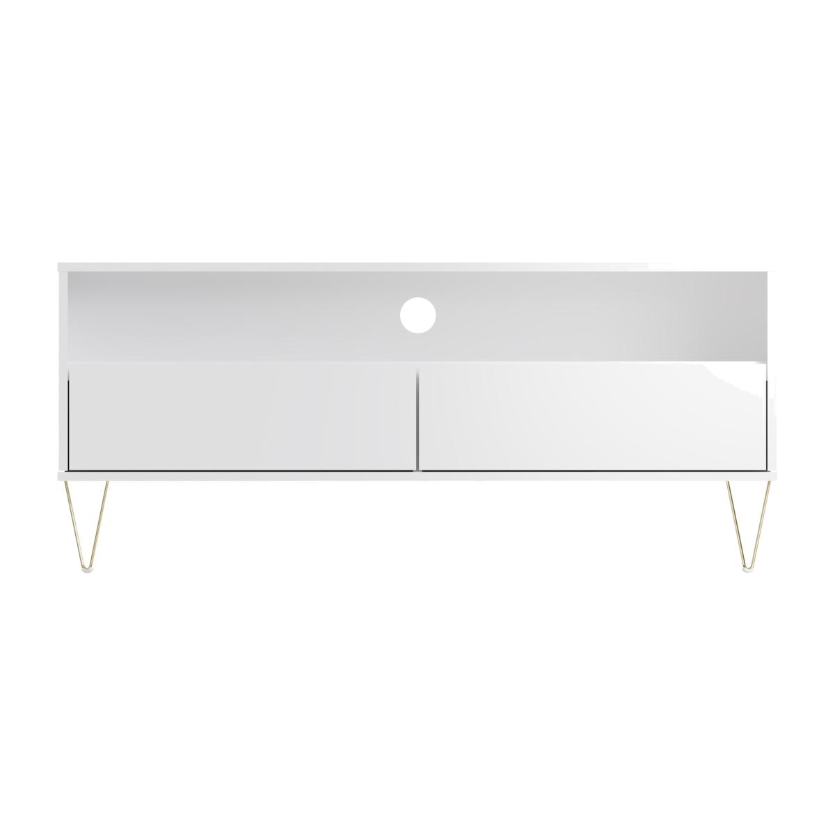 The Monaco Range will add style and sophistication to your home. The Monaco 2 drawer TV Cabinet in white offers an eye-catching slickness. Featuring one shelf with two drawers for storage, with simplistic, yet stunning gold legs. The Monaco TV Cabinet offers great functionality that looks good with any modern decor. Manufactured using particleboard, each item comes flat packed for self-assembly at home.