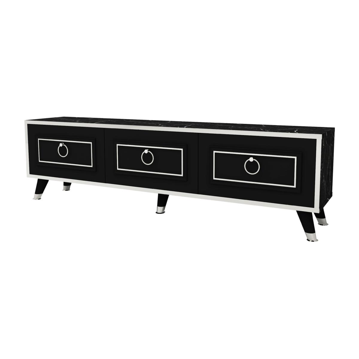 TV Stand 150 cm Wide Media Console with Cabinets Esmera - Black Marble Effect & Silver Band