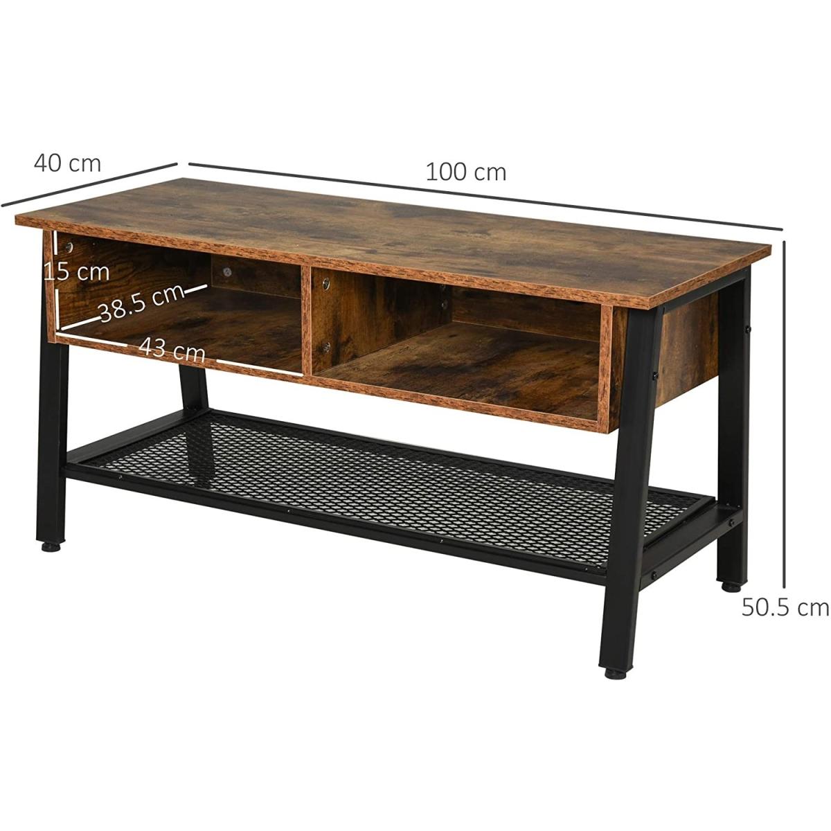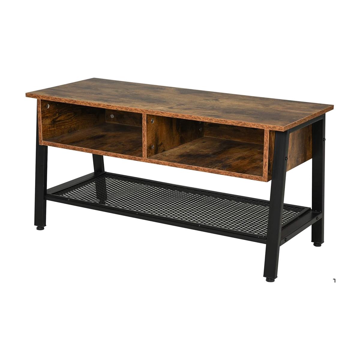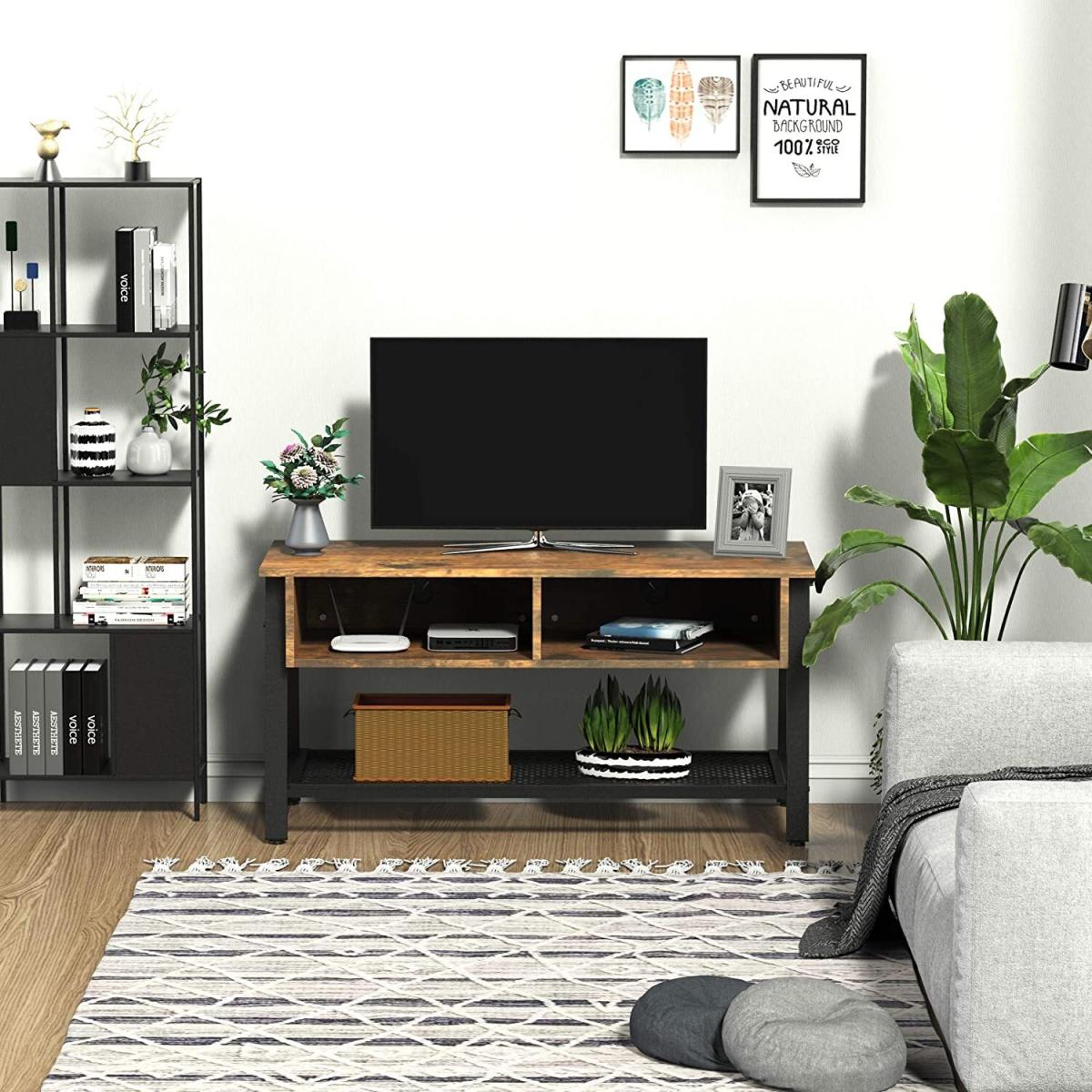 Versatile and unique industrial design which will stand great in all style homes and offices Features two small open compartments, a large mesh shelf and open top for holding your TV or even working from Steel bottom mesh shelf hold everything without bending Two cable holes to manage the wires and keep them together. Rubberwood base and legs for a solid structure, with a durable particleboard top in a smooth finish Adjustable foot pads to keep the balance. Tabletop is suitable for TVs smaller than 45''. Maximum load 50kg, easy to assemble.