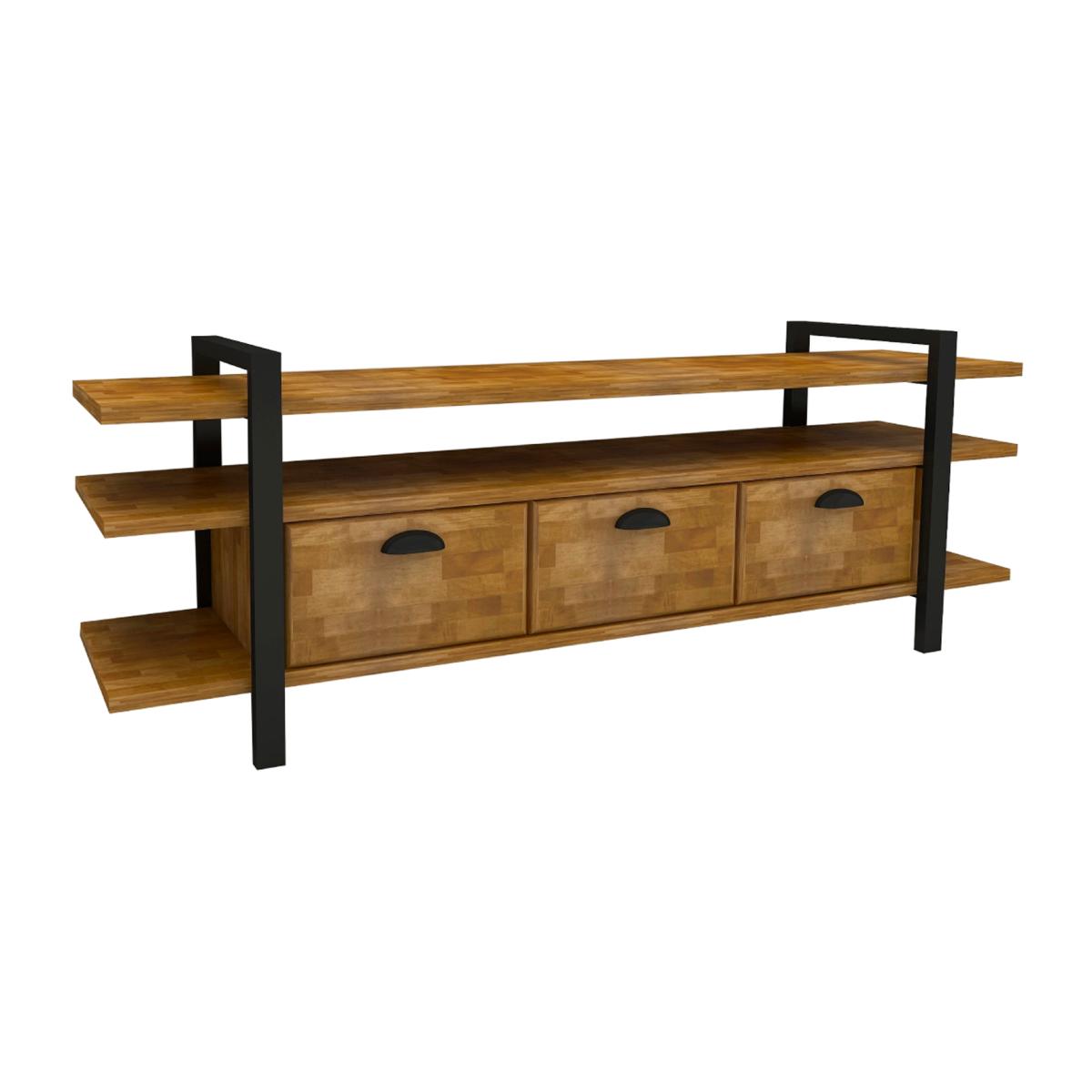 Metal finish - Powder coating 3 doors with concealed metal hinges. Packed weight - 70.5 lb. 32 kg Assembly tools - Power drill and screwdriver. Country of origin - Turkiye. Crafted from solid pine wood and reinforced with an iron metal frame, this TV stand and media console is the perfect piece to showcase your flat-screen TV up to 65 inches, while providing ample storage space with 3 cabinets and shelves. The smooth oval wood edges and water-resistant wood surface are complemented by powder-coated metal finishes and metal frame, legs, and concealed metal hinges on the 3 doors. This handmade console is easy to assemble with only a power drill and screwdriver, and it has an impressive packed weight of 70.5 lb. 32 kg. MATERIAL Manufactured from natural pine solid wood. There may be a difference in the tone of colour originating from the natural wood we use in our products. Please consider this condition when ordering. FRAME Constructed from iron metal and coated with scratch-resistant static powder. Metal finish - Powder coating. ADDITIONAL INFORMATION It is completely handmade. Health-friendly wood preservatives are used. The accessories shown in the photos are not for sale. The trees and natural woods we use in our products are obtained from completely dried, planned felling (of old trees). No process of cutting down trees is carried out that would harm nature. CLEANING You can clean your wooden furniture with a damp cloth. Avoid prolonged contact with your product with copious amounts of water. ASSEMBLY The product will be delivered to the customer in the original package as disassembled. It is designed to be assembled by the customer using a power drill and screwdriver. Assembly instructions and installation hardware are included in the package. Product parts are numbered with stickers following the assembly guide for fast and error-free installation.