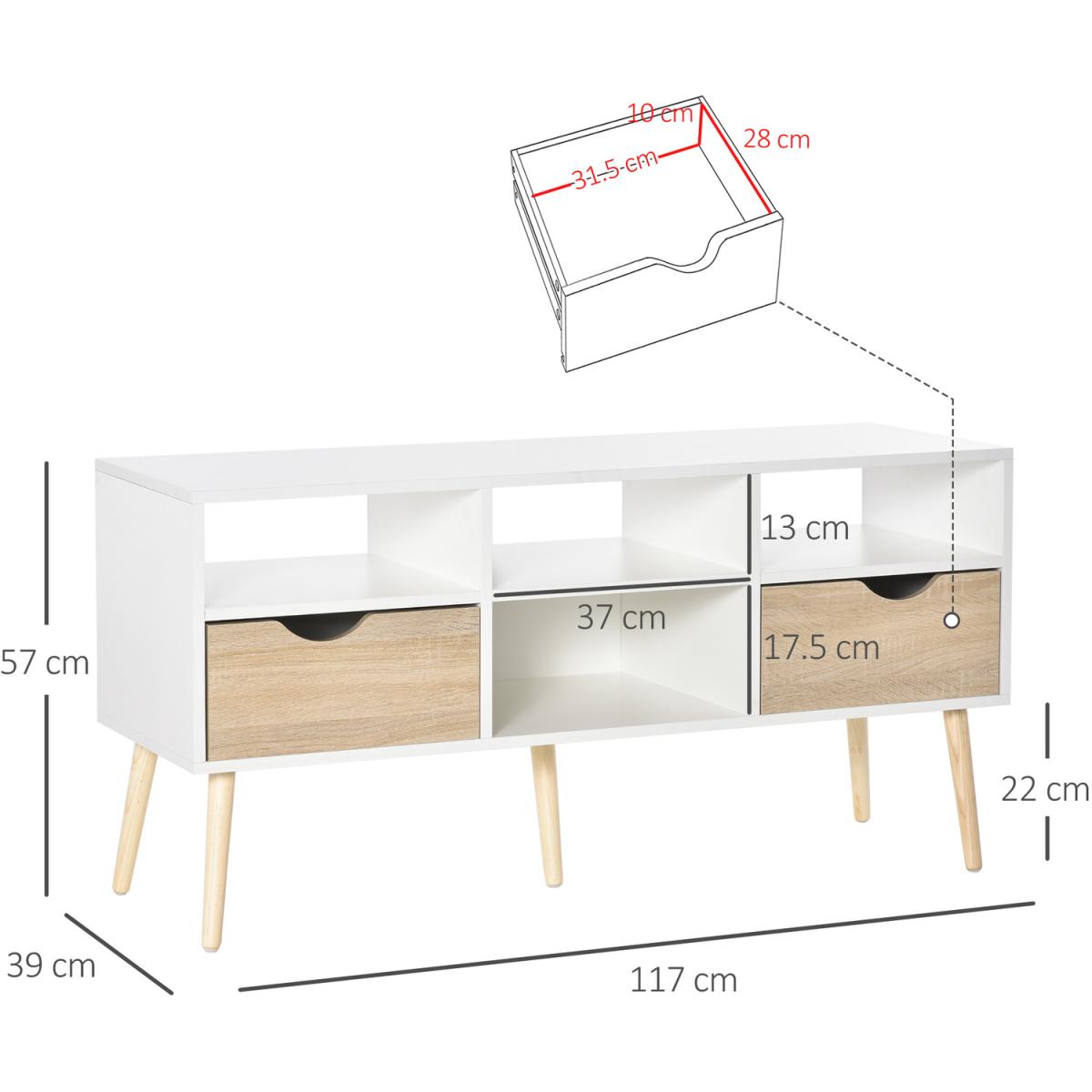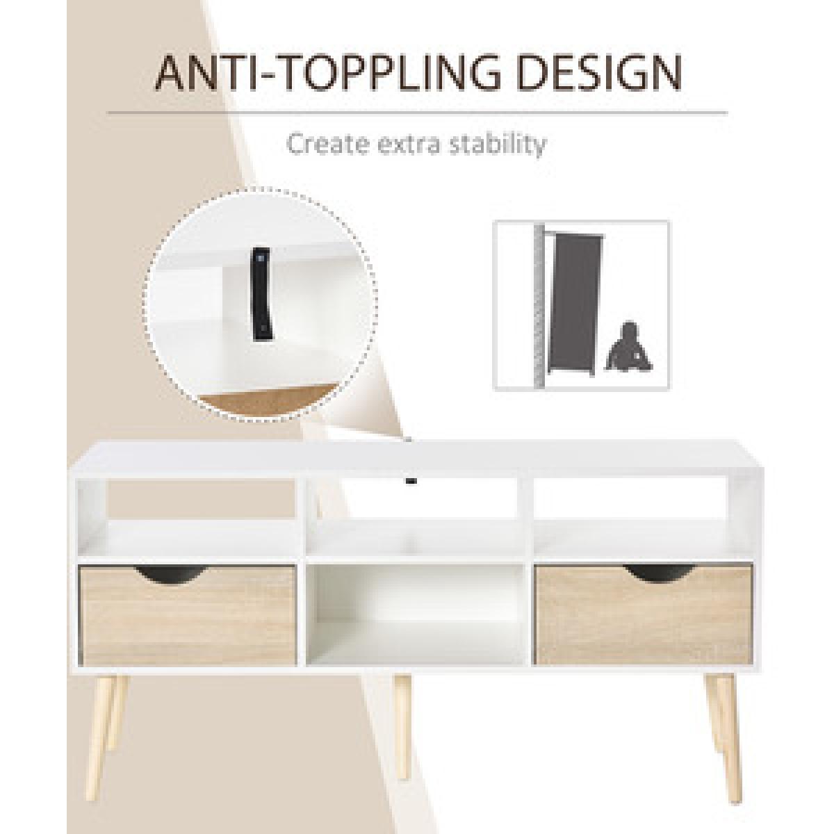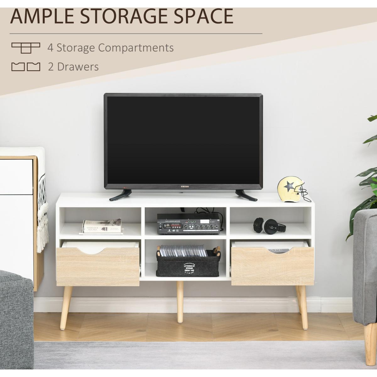 Take HOMCOM TV Stand to make your home fashionable! There are five open compartments and two closed drawers, so perfect for your storage needs and keep your privacy at the same time. You can put your media equipment in the cabinet without any worry about clutter. With five stable wood cabinet legs, the stability can be ensured and perfect for floor cleaning. The perfect partner to your entertainment and relaxation times, watching your favourite show or film.