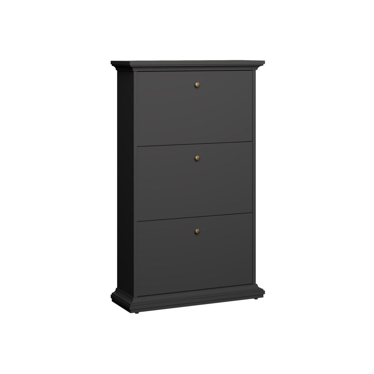 Romantic design dark grey shoe cabinet with three easy to open drawers each with metal knob handle. This will keep your shoes tidy in place and can be fitted in the room of your choice. Shoe Cabinet comes with complete assembly instructions. Part of the Paris collection. Made from wood effect and foil faced chipboard. Size H127.8, W18, D27.45cm. Weight 27.9kg. Stores an average of 15 pairs of shoes. 3 fixed shelves. Freestanding. For wall mounting only. Self-assembly. If this product is over 60cm high it must be securely attached to the wall to prevent overturning. Package Dimensions:Package 1 dimensions: H17.9, W131, D39.1cm. Package 1 weight: 29.7kg.