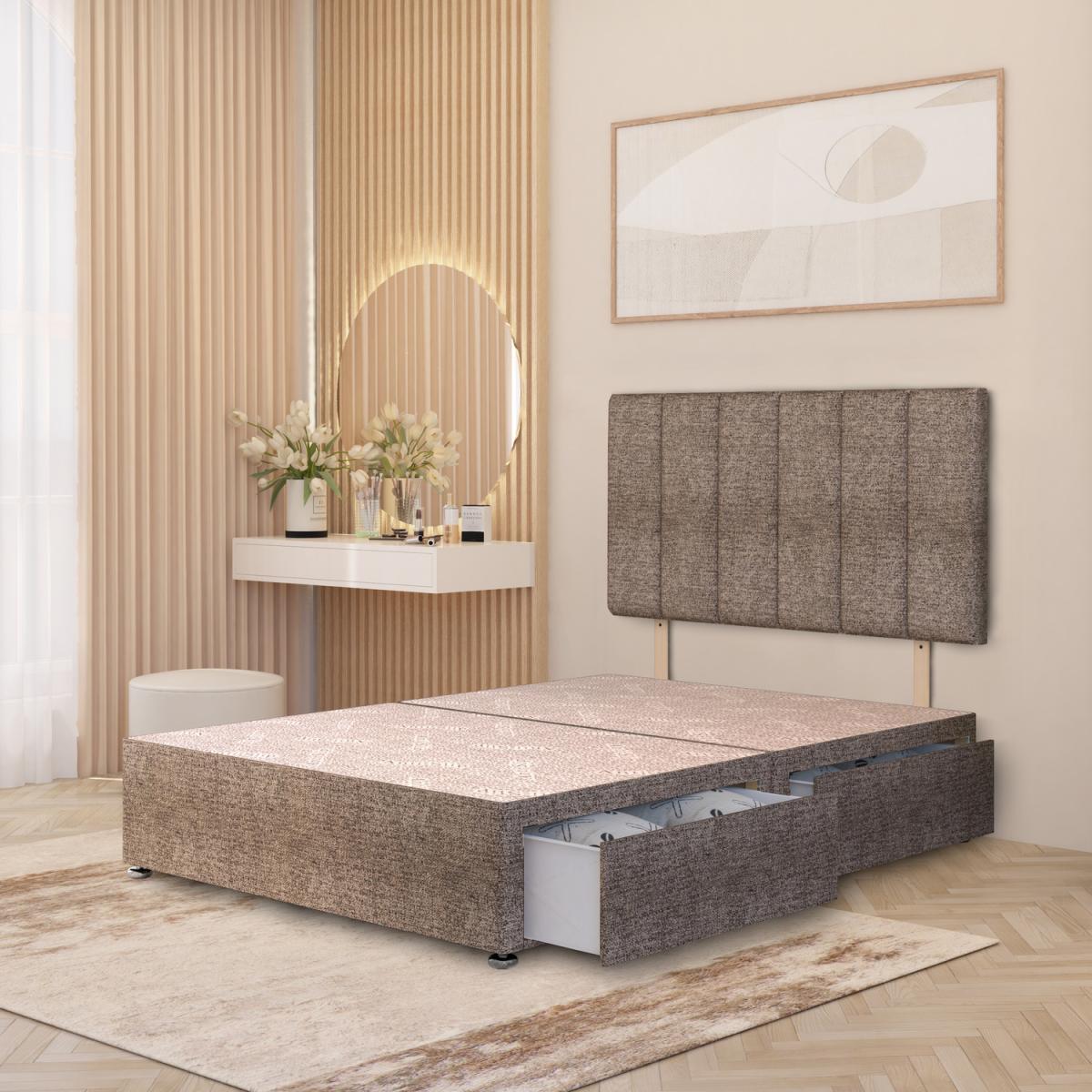 The Austin Divan Bed Base with 32" Upholstered Headboard combines timeless design with long-lasting support, making it the perfect centrepiece for any modern bedroom. Built with a solid platform top divan base, it provides a firm, stable surface to maximise mattress comfort and performance. Expertly crafted in the UK from high-quality timber and finished in premium tweed fabric, this luxury divan bed offers both durability and style. The tall upholstered headboard with struts features soft cushioned panels offering a luxurious look, and also ideal for sitting up in bed. Base height 34.5cm with gliders. An excellent space saving storage bed. Drawers can be placed left or right side as the headboard fits either end of the base.