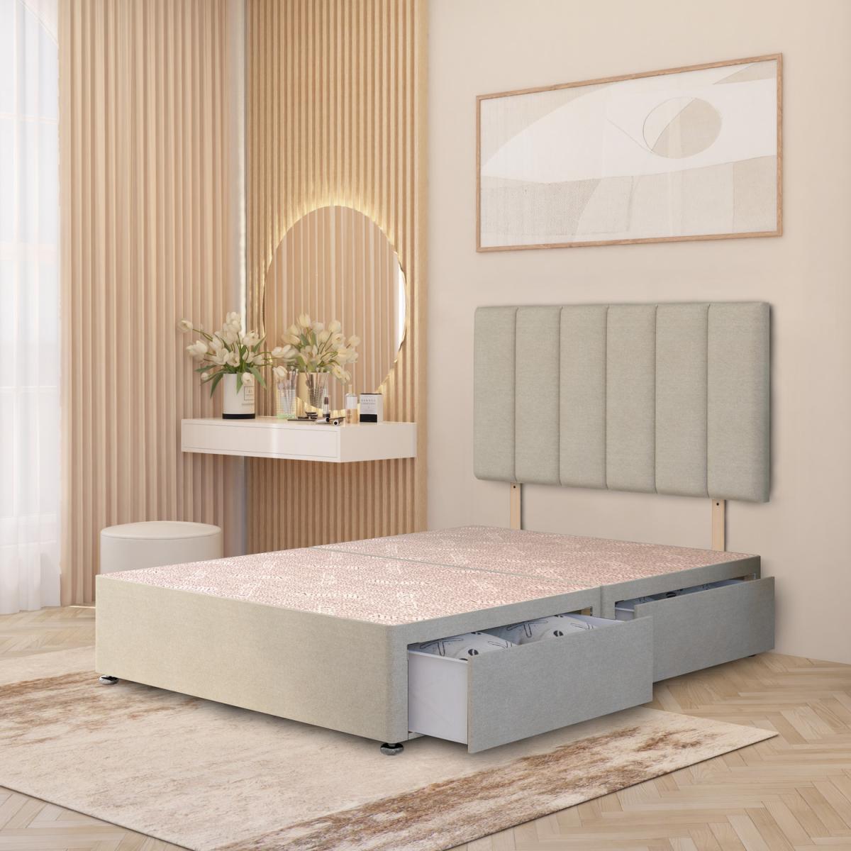 The Austin Divan Bed Base with 32" Upholstered Headboard combines timeless design with long-lasting support, making it the perfect centrepiece for any modern bedroom. Built with a solid platform top divan base, it provides a firm, stable surface to maximise mattress comfort and performance. Expertly crafted in the UK from high-quality timber and finished in premium tweed fabric, this luxury divan bed offers both durability and style. The tall upholstered headboard with struts features soft cushioned panels offering a luxurious look, and also ideal for sitting up in bed. Base height 34.5cm with gliders. An excellent space saving storage bed. Drawers can be placed left or right side as the headboard fits either end of the base.
