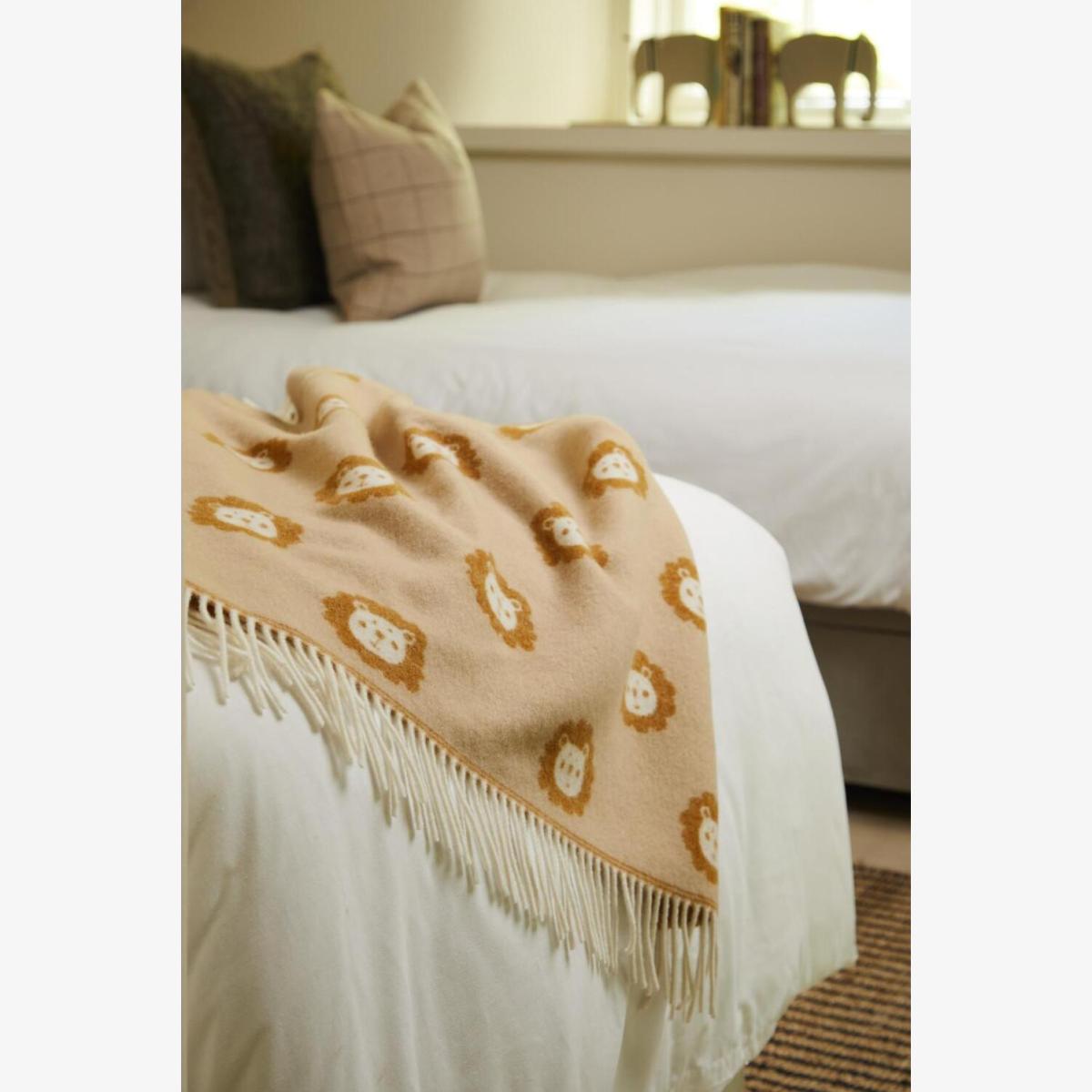 I love this little lambswool blanket for its cosy, timeless appeal and its soft, inviting texture. It works particularly well in nurseries, children's rooms, or add a gentle touch to a living room or bedroom accent. The lion motif adds a playful yet sophisticated element that complements both traditional and contemporary decor styles. Practical styling tips include draping it over a armchair for easy access or folding it neatly at the foot of a bed to introduce warmth and character. Pair it with neutral tones or subtle patterns to allow the blanket’s charm to stand out, making it a versatile piece that effortlessly brings warmth and a touch of whimsy to any space.