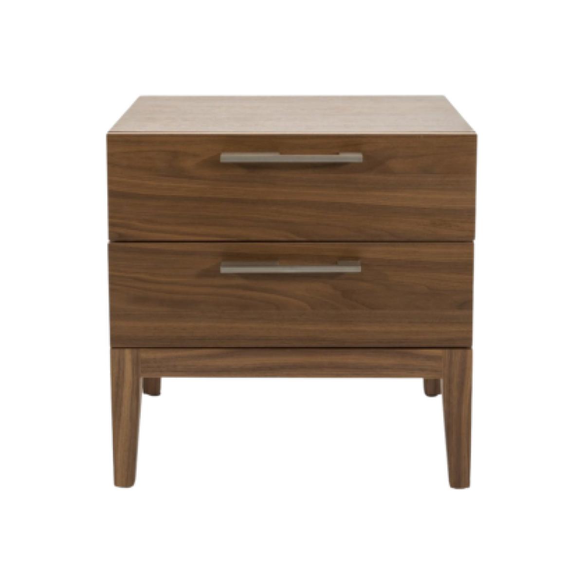 Calla two drawer walnut bedsides come with soft close drawers and a contemporary metal handle Dimensions: 50 x 41.1 x 50cm. Shaped Stainless-Steel Handles Care Instructions:Dust regularly, wipe occasionally with a damp white cloth Materials: MDF 0.6mm Veneer