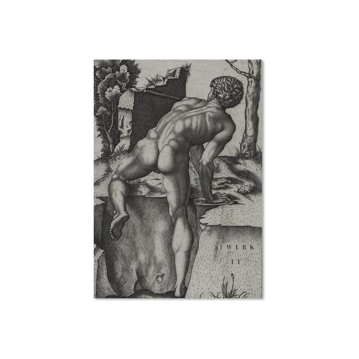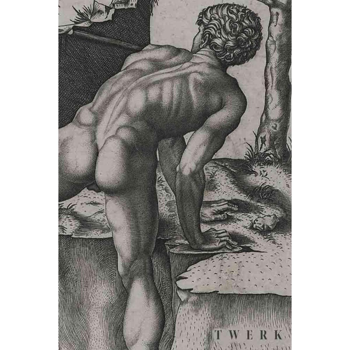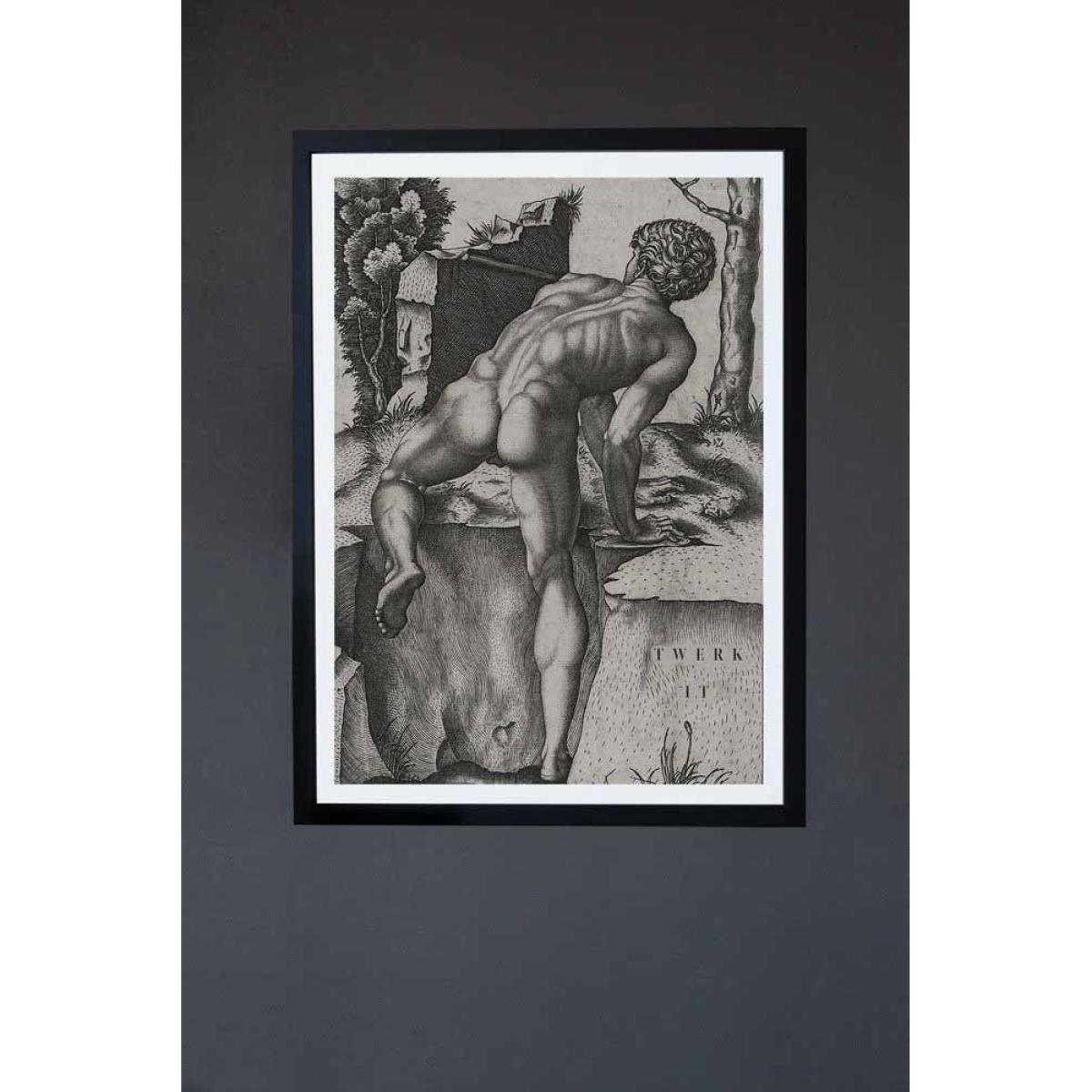 About The Twerk It Art PrintAvailable framed or unframed, the Twerk It Art Print is a fearlessly fabulous piece of art for any corner of your home with a playful motif. Featuring a black and white renaissance style painting of a naked man, this show stopping Wall Art Print is a traditional meets modern design that is ultra cheeky and bursting with character. Why We Think You’ll Love The Typography ArtEncapsulating a one of a kind charm, this Unique Wall Art showcases the rear of a muscular man, a marvellous monochrome print that you will not regret! A Modern Art Print that will stand out from the rest, this statement piece of art can be paired with any scheme to create a daring and delightful feel within your home, so what’s not to love?!Where To Style The Contemporary Art PrintBring a timeless elegance to your bedroom by using this Black and White Wall Art as the stunning centrepiece of any wall and why not pair it with additional art for a boldly beautiful feature display. The perfect Bathroom Art Print to add interest to a plain wall, this magnificent piece will seamlessly transform the space, creating the wow factor from the moment you walk into the room.