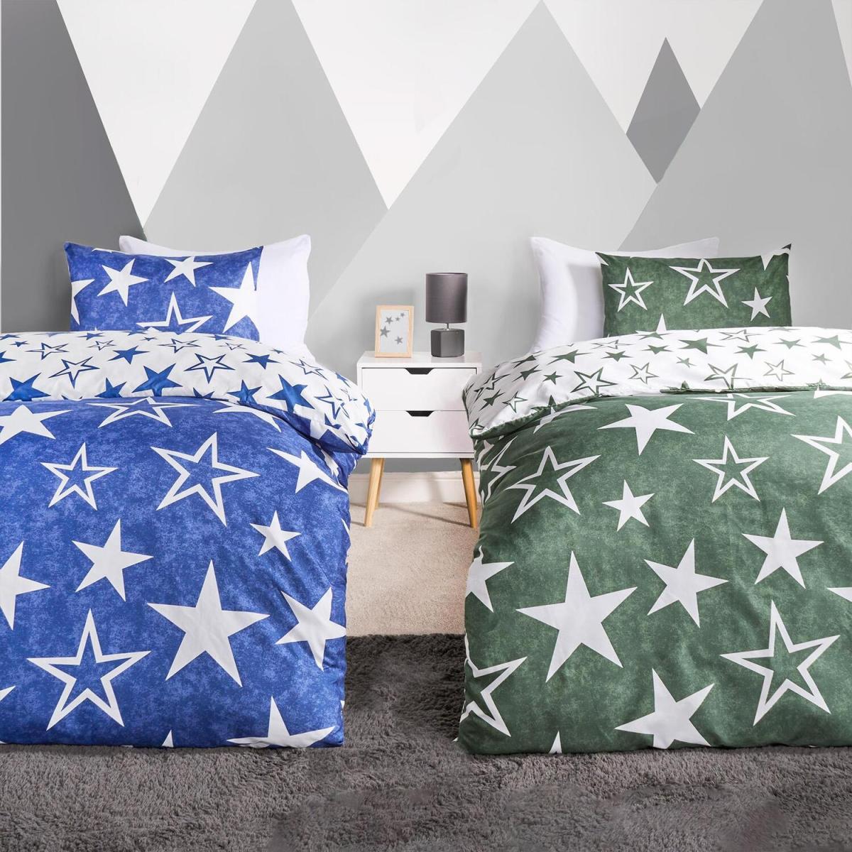 This twin pack includes two duvet sets, each featuring charming star prints in navy and green. The first set showcases a delightful navy star print, while the second set boasts an equally enchanting green star print. What makes These duvet sets are set apart by their reversible feature the reverse side of each set features the same star print with reversed colors on a white background. Crafted with the comfort of your child in mind, this twin pack offers a cosy and stylish solution for their bedroom. Let your little one enjoy the versatility of two distinct looks, whether it's the serene navy or the vibrant green stars, all in a reversible and playful design.