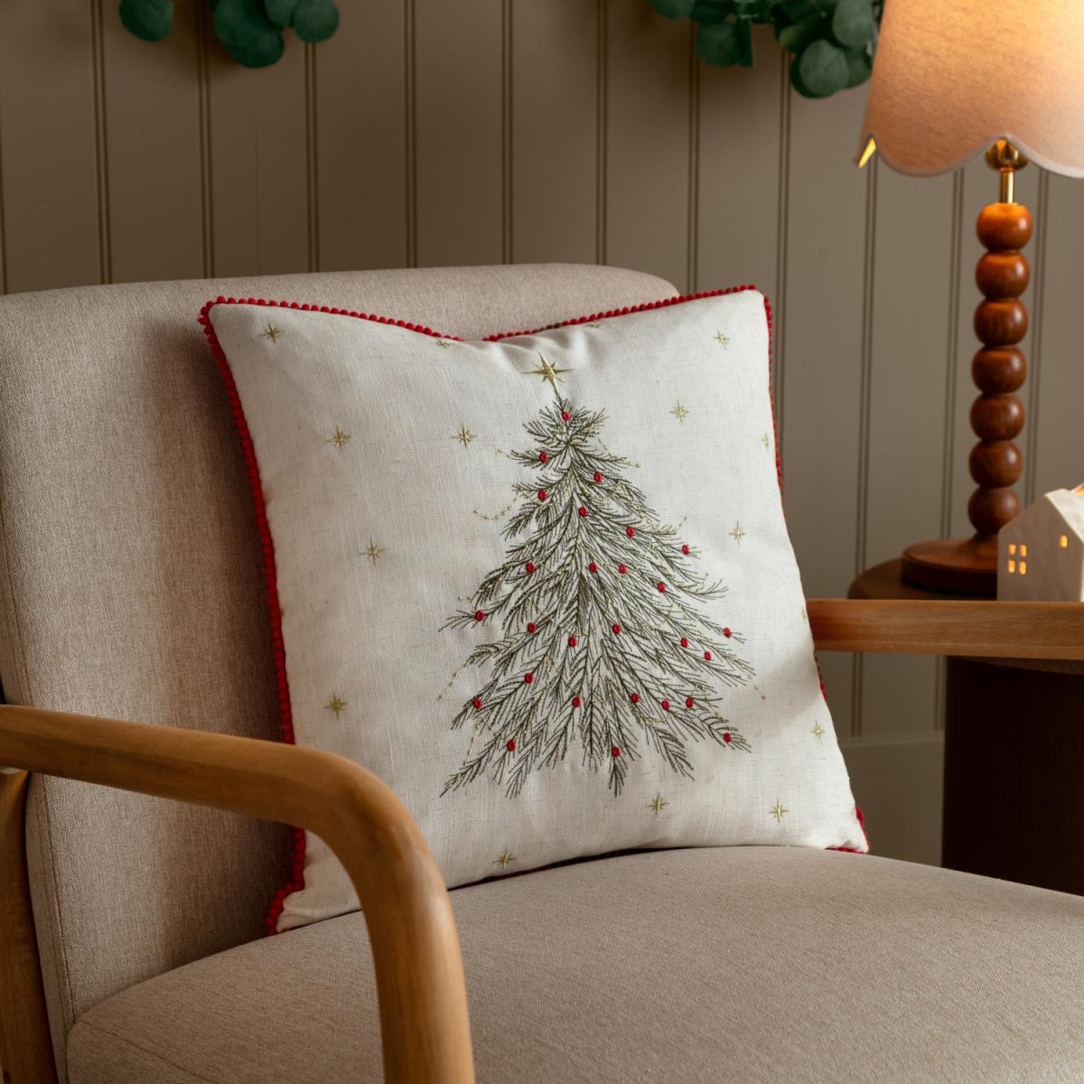 Add a touch of timeless elegance to your home this holiday season with the Twinkling Tree Cushion. Featuring a linen-look textured face adorned with a beautifully embroidered Christmas tree, complete with golden stars and vibrant red baubles, this cushion is a celebration of traditional festive decor. The intricate embroidery, enhanced by shimmering metallic thread, is complemented by a red ric rac trim, lending a refined, handcrafted finish. With a plain velvet reverse and convenient zip closure, its as practical as it is charming. Whether displayed on your sofa or nestled in a favourite armchair, this cushion captures the warmth and nostalgia of a woodland Christmas.
