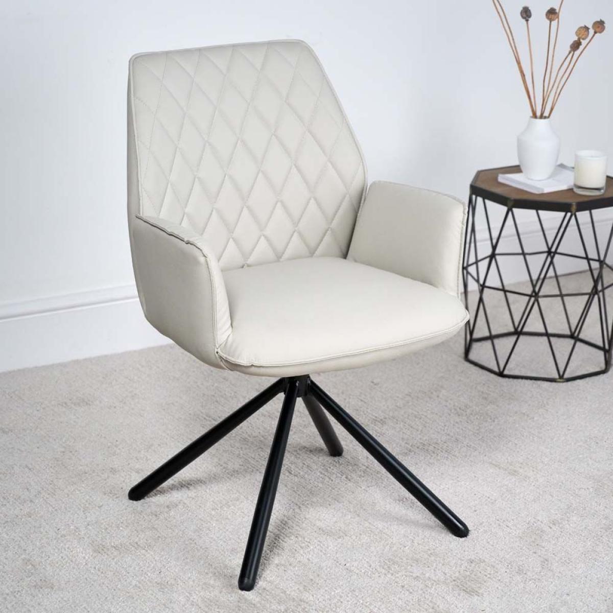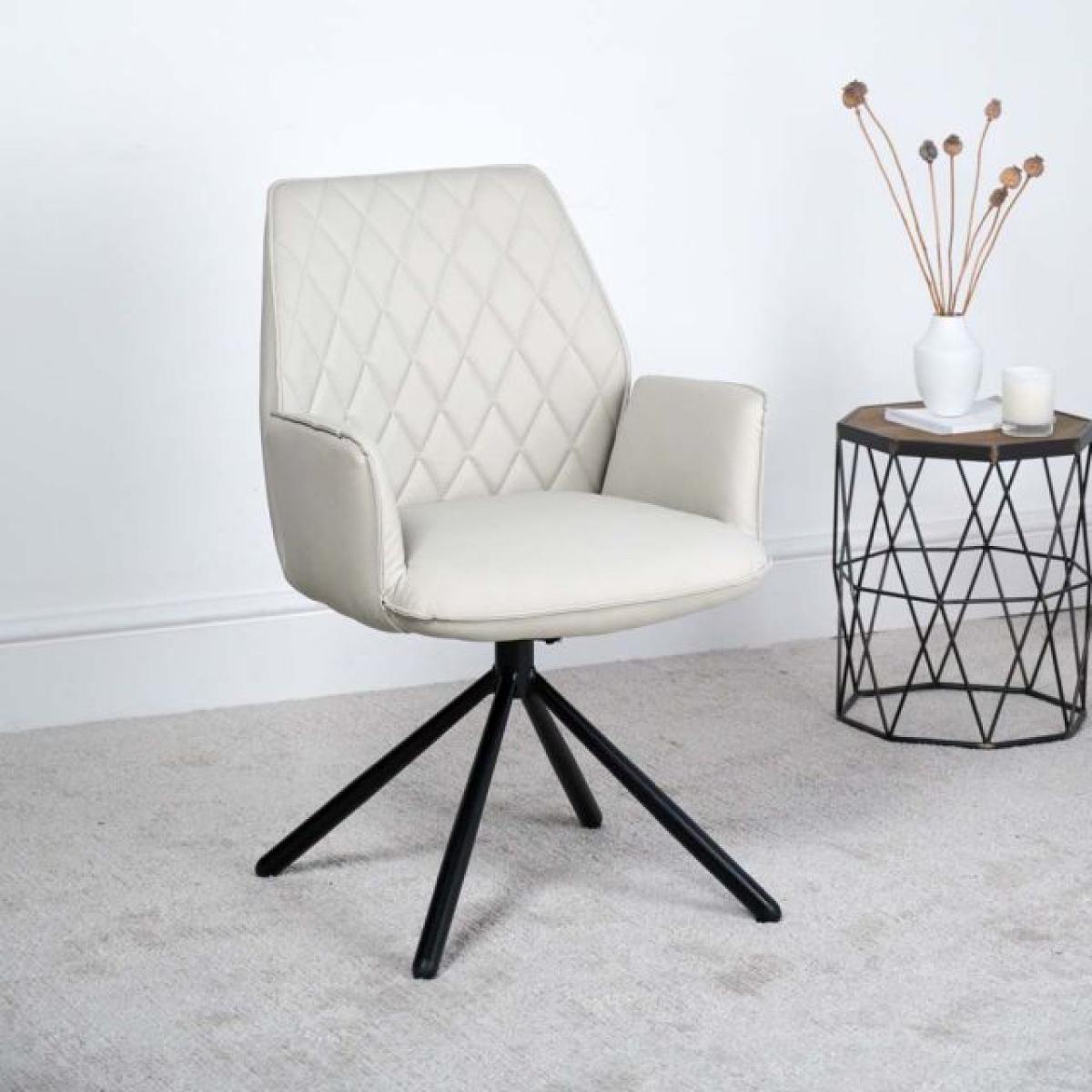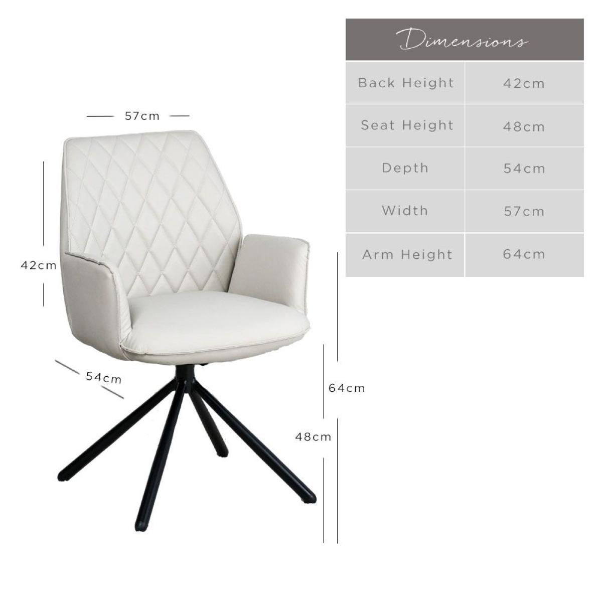 The Twist dining chair in this cool chalk tone is a soft dining chair with arms at a perfect height for support. It features a wonderful faux leather upholstery with a diamond stitched back on the interior and a great swivel function that springs back to the centre position to keep things tidy. Also available in six alternative colours. Dimensions: H90cm x W57cm x D54cm Simple self assembly. Sold as single chairs