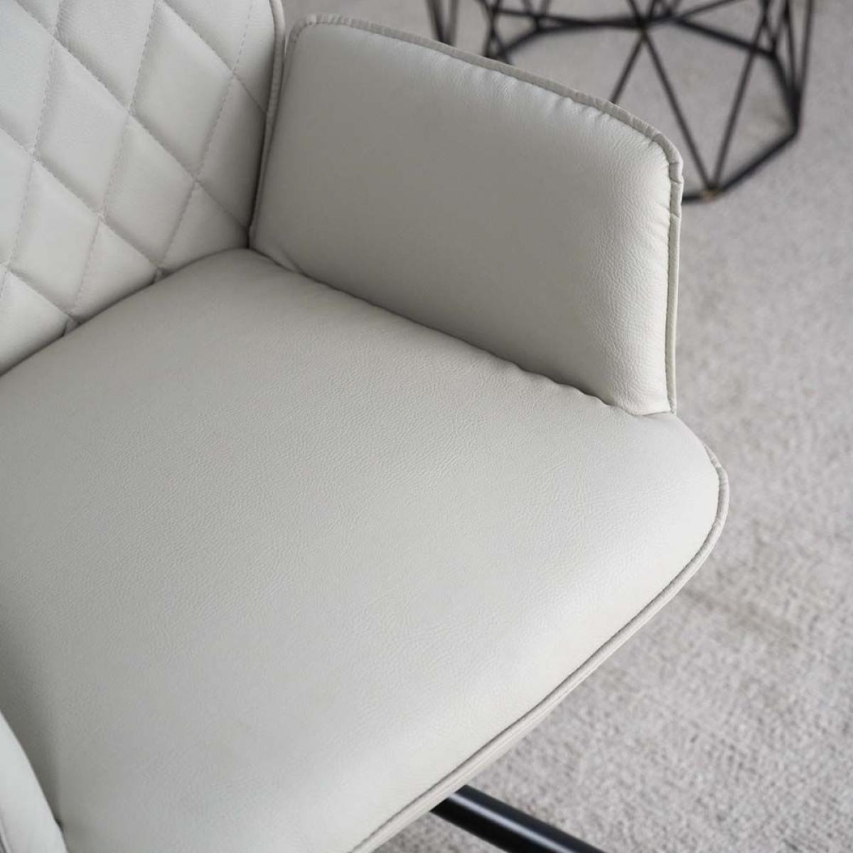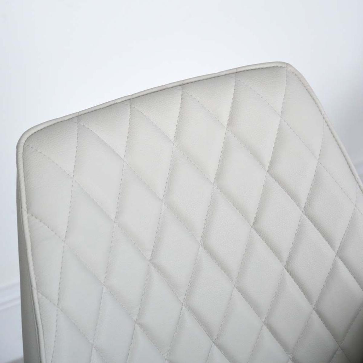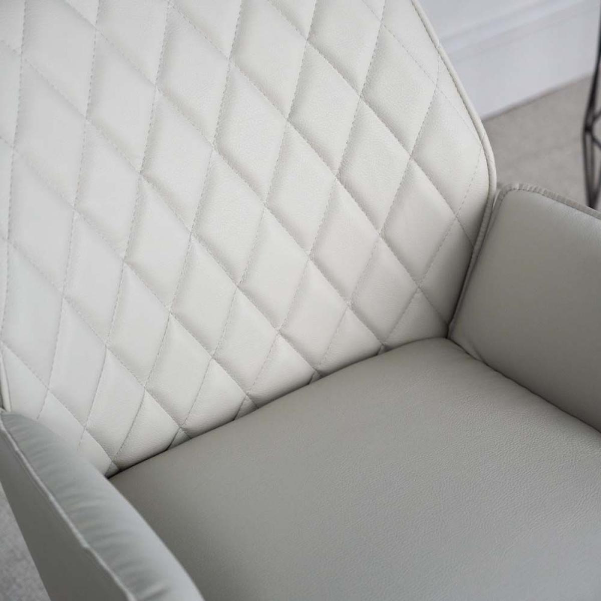 The Twist dining chair in this cool chalk tone is a soft dining chair with arms at a perfect height for support. It features a wonderful faux leather upholstery with a diamond stitched back on the interior and a great swivel function that springs back to the centre position to keep things tidy. Also available in six alternative colours. Dimensions: H90cm x W57cm x D54cm Simple self assembly. Sold as single chairs