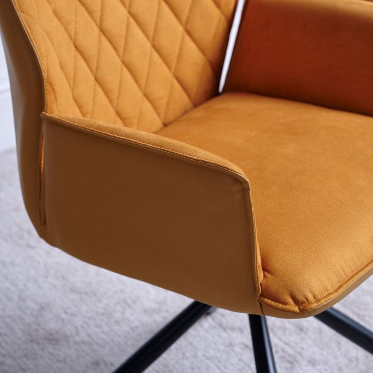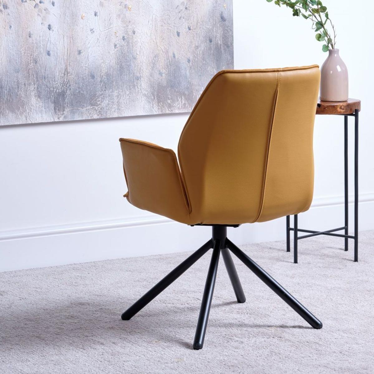 Make a statement with the Twist mustard dining chair - it combines a modern upholstered seat in a soft faux leather with black metal legs. Use this mustard dining chair in your kitchen or dining room, or even your home study, as the armrests sit at the perfect height. Also available in teal, grey and tan. Dimensions: H90cm x W57cm x D54cm. Seat Height: 48cm. Arm Height: 64cm Chair features a 180 degree sprung rotation Simple self assembly Fabric samples available on request