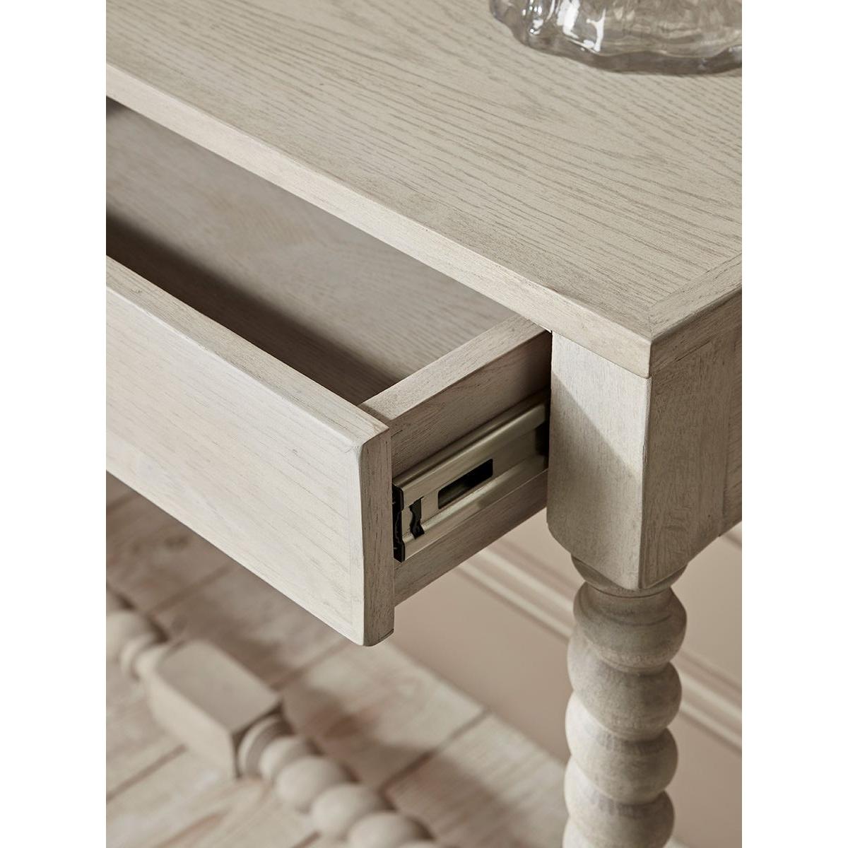 Traditional barley twist carved legs add character to this charming console table.  A versatile piece for any room in the house, the pale toned acacia wood table offers two drawers for storage, complemented by burnished iron hardware. A timeless addition to both contemporary and classic homes.