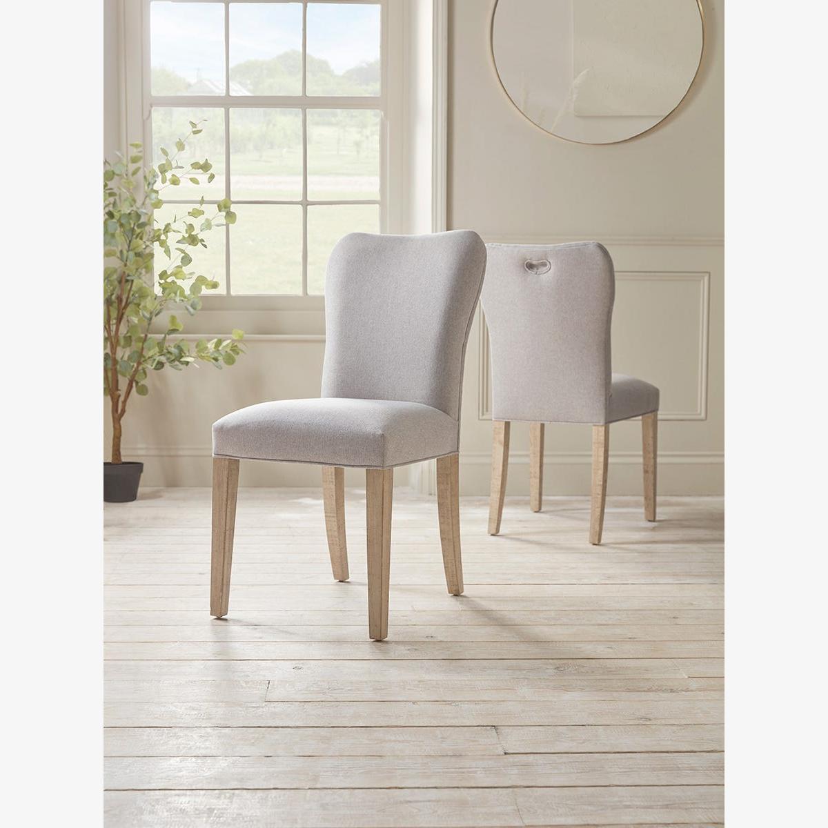 Upholstered in a warming grey, our Adina dining chairs have an elegant timeless design. With natural wood legs, these chairs will bring sophisticated charm to your dining experience.  Pair with our Adina extendable dining table and our Adina bench for the completed look.