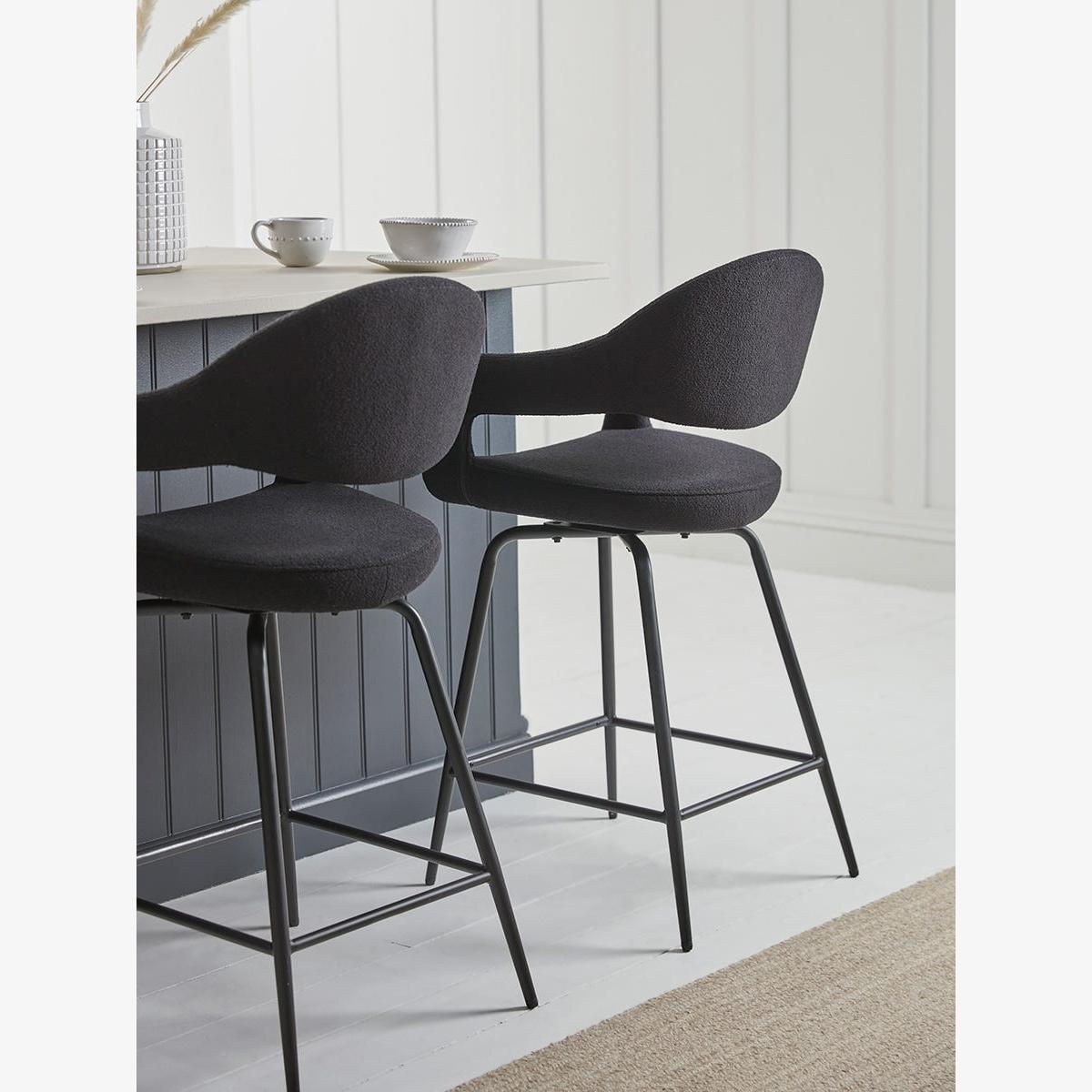 A natural accompaniment to our Bouclé Dining Chairs, these matching Counter Stools bring the same chic combination of neutral tones and effortless comfort to your setting. With seats fully upholstered in a versatile grey fabric, the stools are sold as a pair and offer comfortable curves, cocooning arms and contrasting black metal legs. Also available in white.