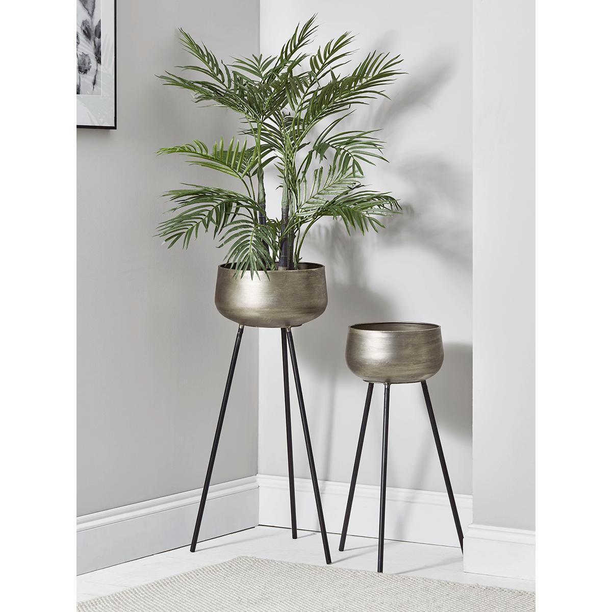With a subtle brushed gold finish and three slim black iron legs, our statement planters will make a feature of your favourite houseplant and add a decorative accent to your space. Nest together to create a stylish botanical space in your home.