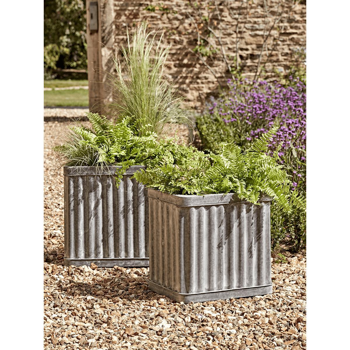 Hand finished with a vintage effect, our set of two square zinc planters will lend a touch of classic contemporary style to your garden. Each set has one small and one medium-sized planter, both with a corrugated effect finish.