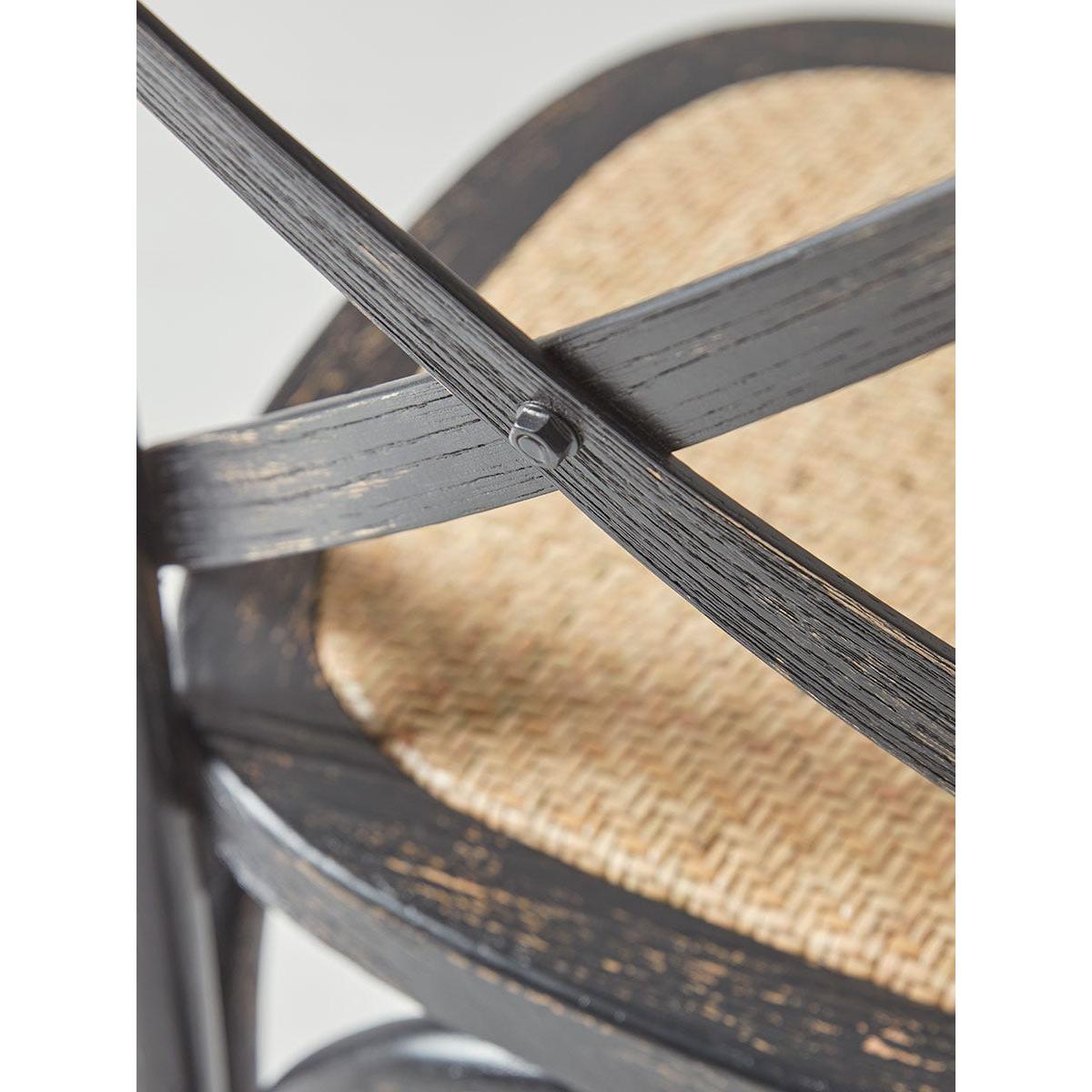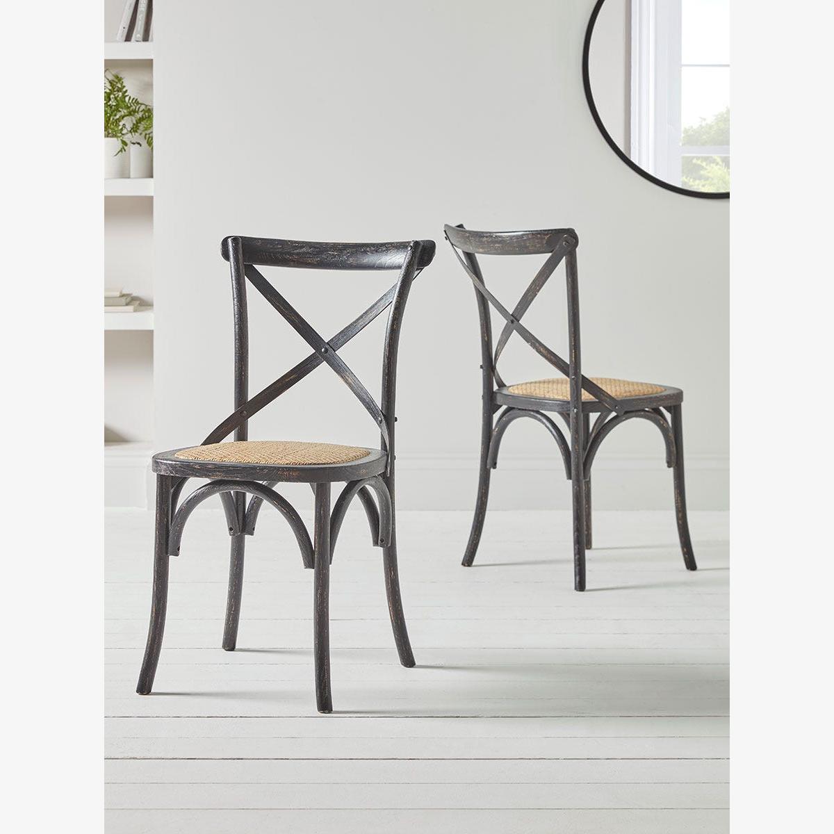 Inspired by classic French cafe designs, our Cross Back Dining Chairs are full of elegant charm that will enhance your home for years to come. Made from solid oak and painted in a gently aged black, with contrasting rattan seats, these chairs will bring a touch of vintage appeal to any kitchen or dining room. Also available in Natural, they feature the same styling as our Cross Back Counter Stools.