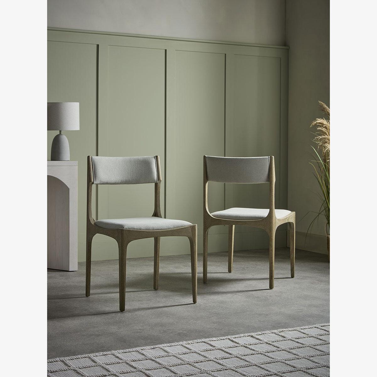 With a pared-back, modern silhouette, our set of two Faro Dining Chairs is crafted from oak, with neutral fabric upholstered seat and back pads. With their simplicity, these chairs make the perfect addition to a home that is inspired by a Scandi style.