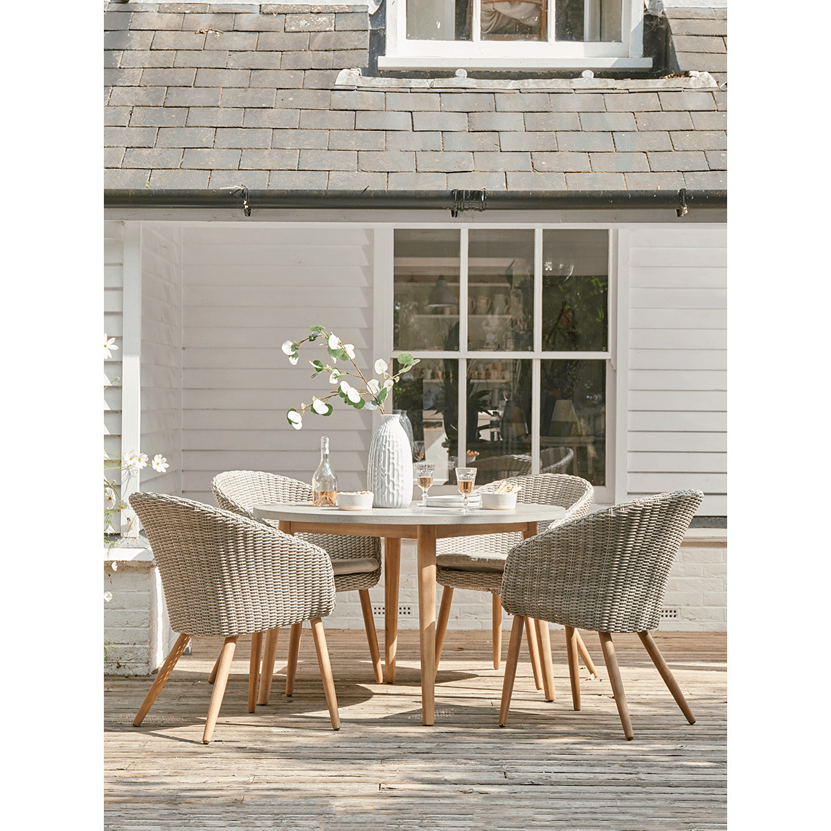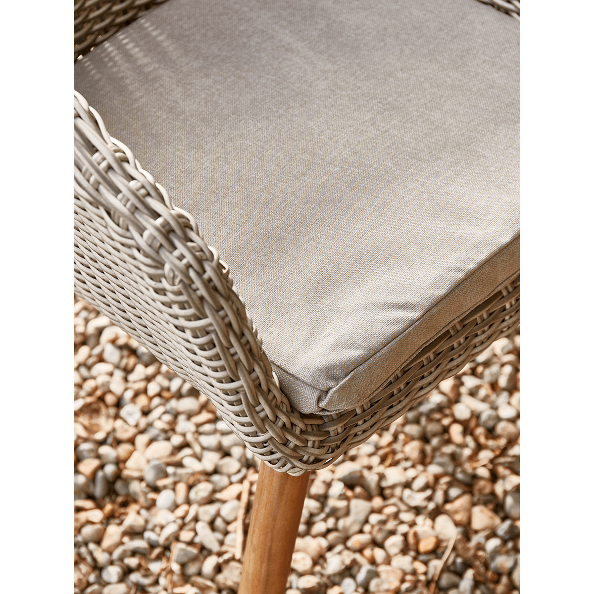 The sturdy woven faux wicker and durable acacia wood add to the elegant appearance of our traditional tub dining chair. With a curved back and gently sweeping arm, our chairs gently support you whilst providing sumptuous comfort with a cushioned seat pad. The gentle contrast of the grey toned wicker to the soft toned wood complements the style of this set and ensures easy placement in all spaces, whether traditional, or modern.