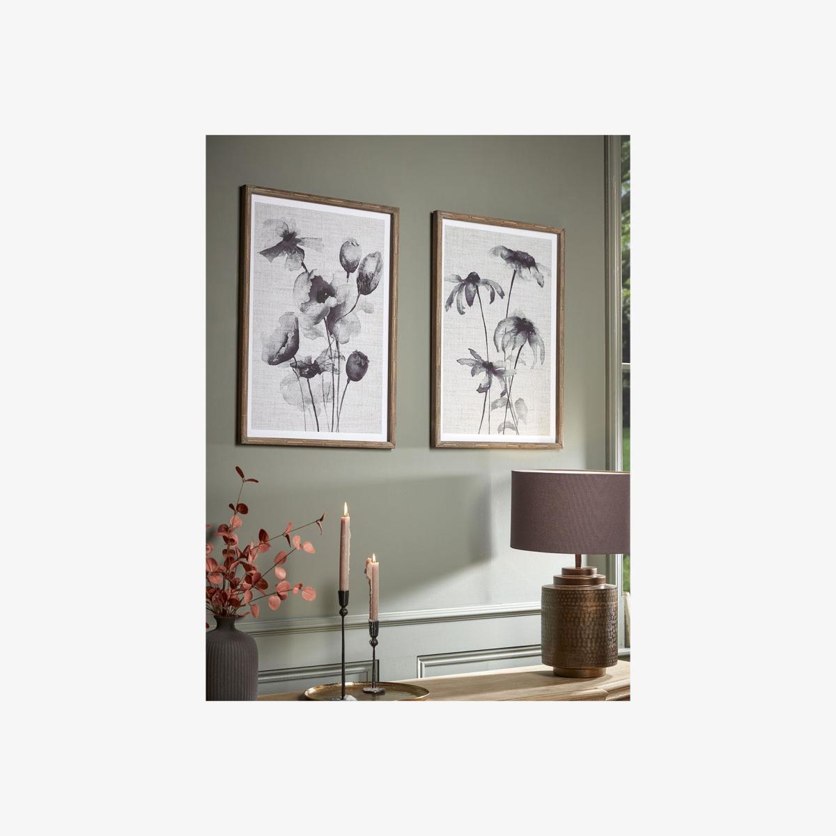 In a wooden frame, two prints feature delicate florals in a black and white colour palette. The prints have a textured effect for a slightly more relaxed feel, which complements the natural grain of the wooden frame beautifully, inviting a calming atmosphere in your space. Hang together or separately to create a unified feel throughout your home.