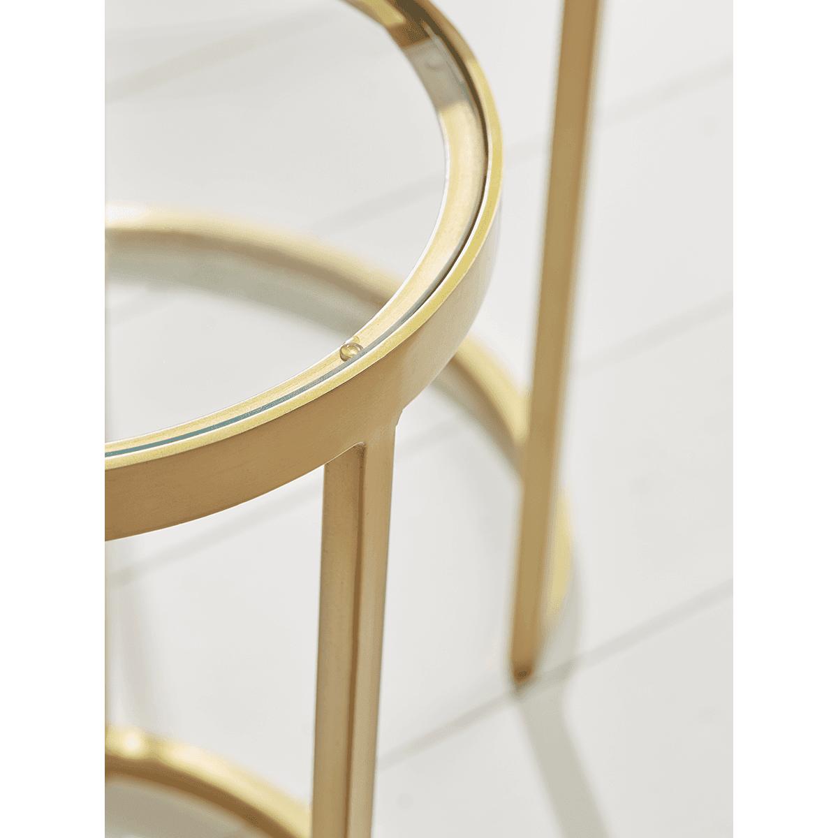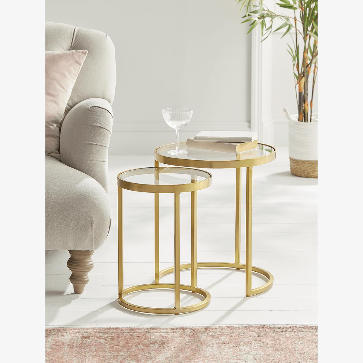 I’m a big fan of these nesting tables for their lightweight metal frames and glass tops - they open up a room and reflect natural light. The warm brass finish sits comfortably in modern, mid-century or eclectic interiors, and the slim design tucks neatly away when you need floor space. For styling, balance the larger table with a stack of coffee-table books and a small plant, while leaving the smaller one clear for a lamp or drinks tray. They work equally well beside a sofa, in an entry hall or as a minimalist bedside solution.