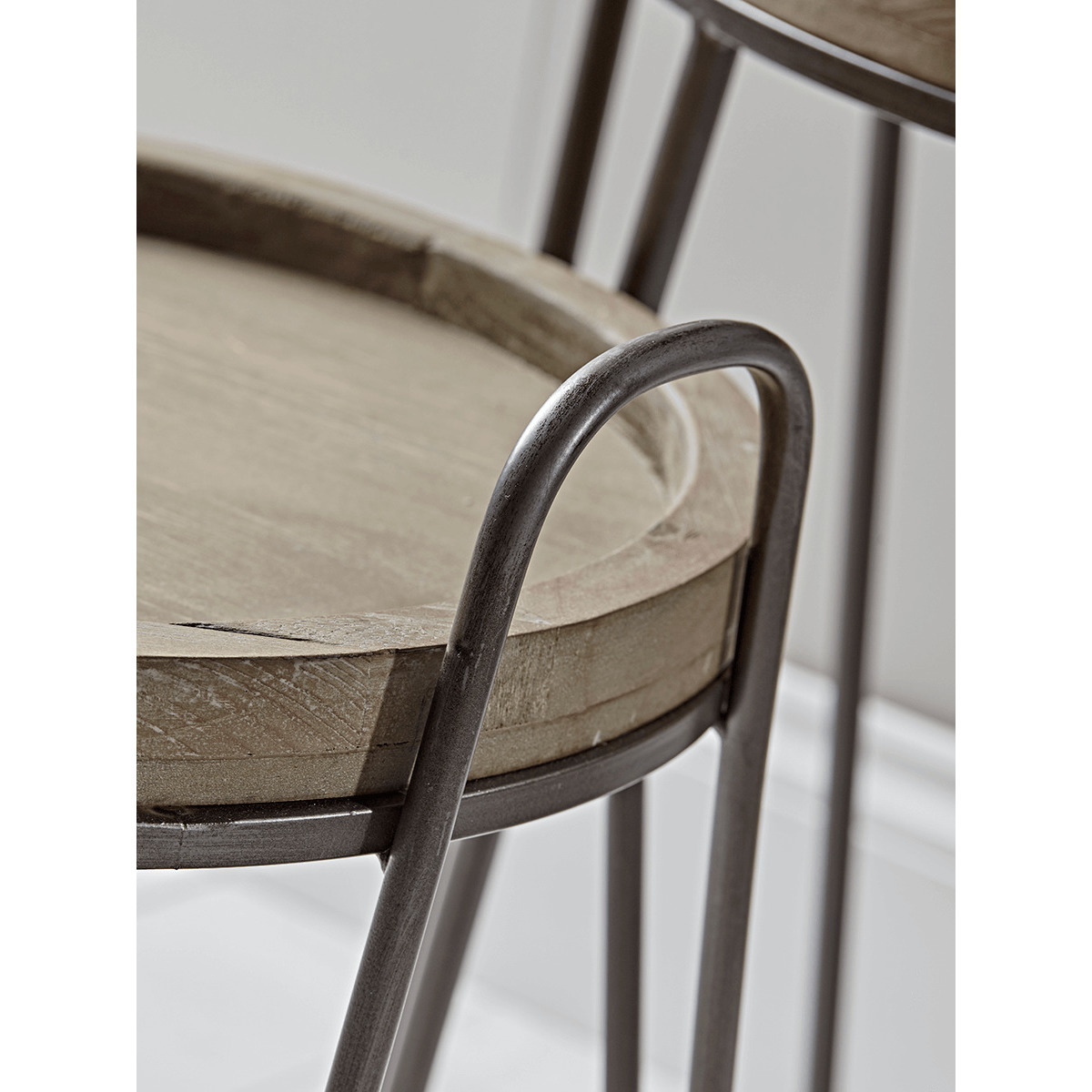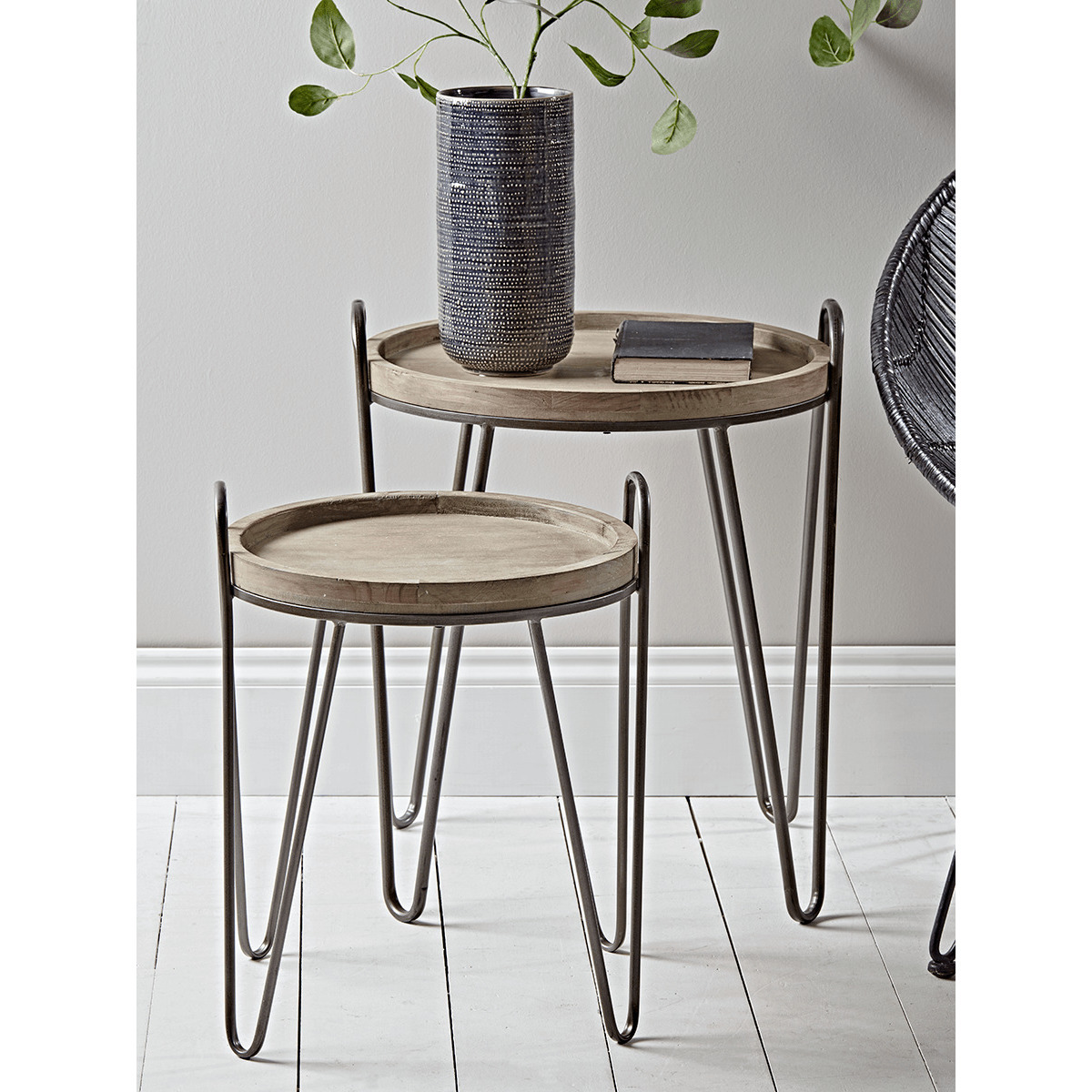 With round tops made from rustic fir, four legs and a unique hairpin frame complete with handles for easy lifting, our set of two nesting tables is perfect for your lounge or bedroom. Expand out to provide a handy extra surface when entertaining guests, then store away when not in use.