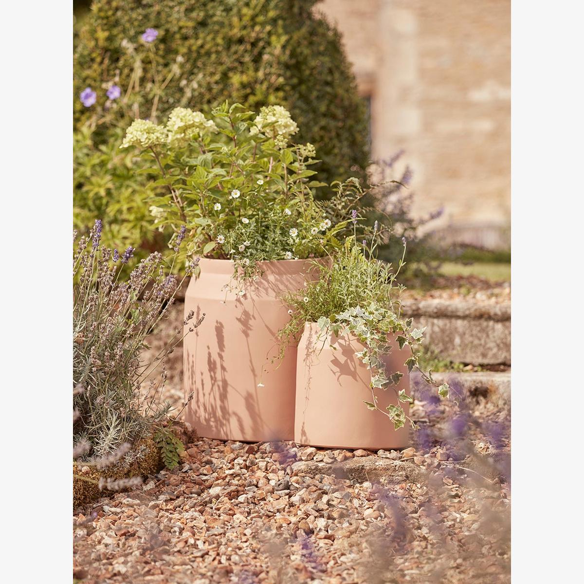Handmade from fibre clay for the look of stone, these outdoor planters are churn shaped with a smooth finish in a pale tobacco colour. There is one large and one small planter in each set which allows you to create a multi layered planting scheme. The lightweight material makes them easier to move around your space when the time comes to alter the landscape.