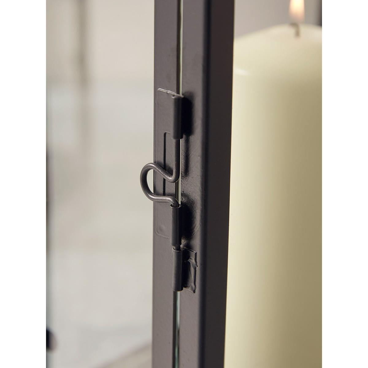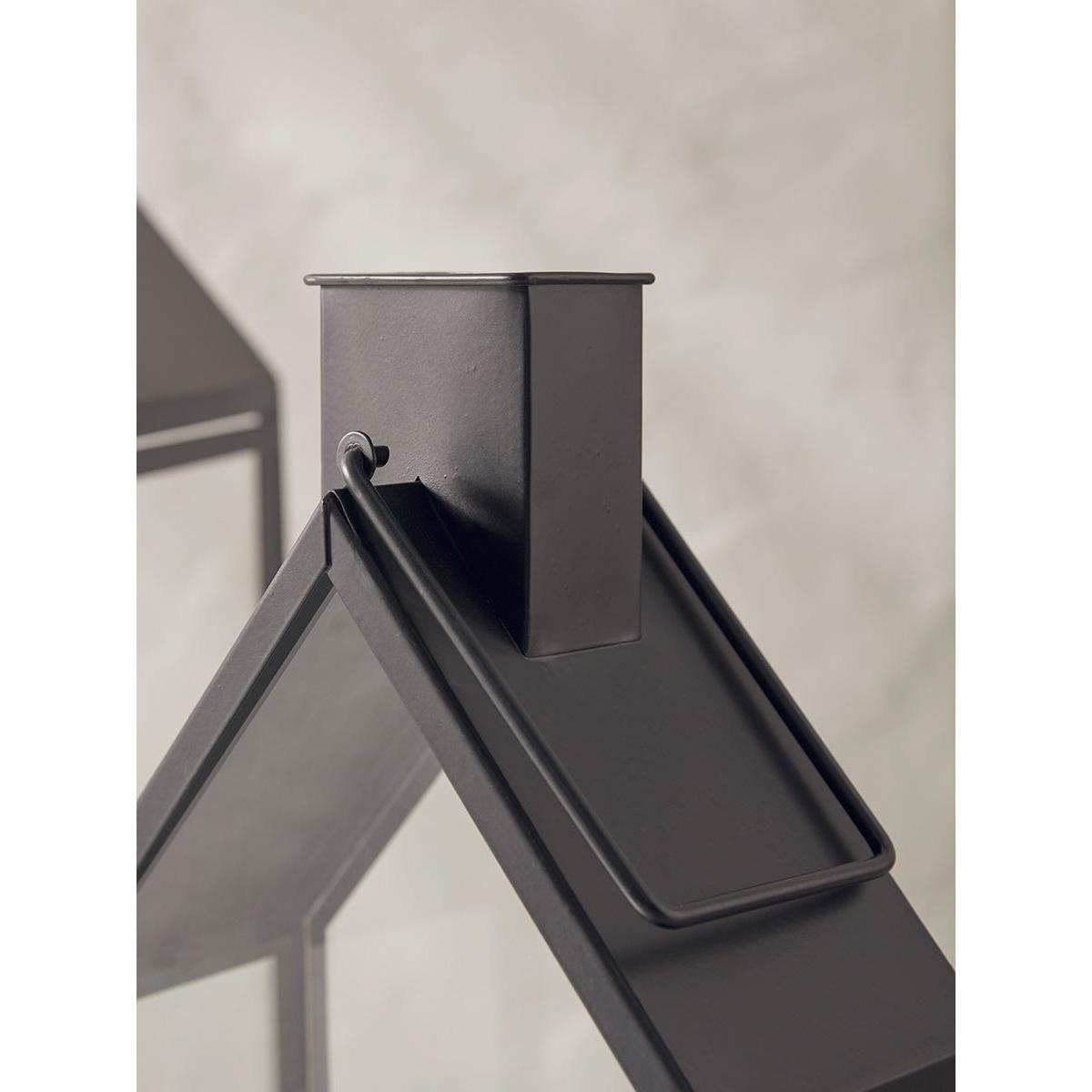 Fill these statement lanterns with several church candles of different heights to create a welcoming glow in your hallway or to support your fireside scene. Each lantern forms the silhouette of a house in black iron, complete with a little chimney and a hoop for hanging or carrying. There is one large and one small lantern in each set.