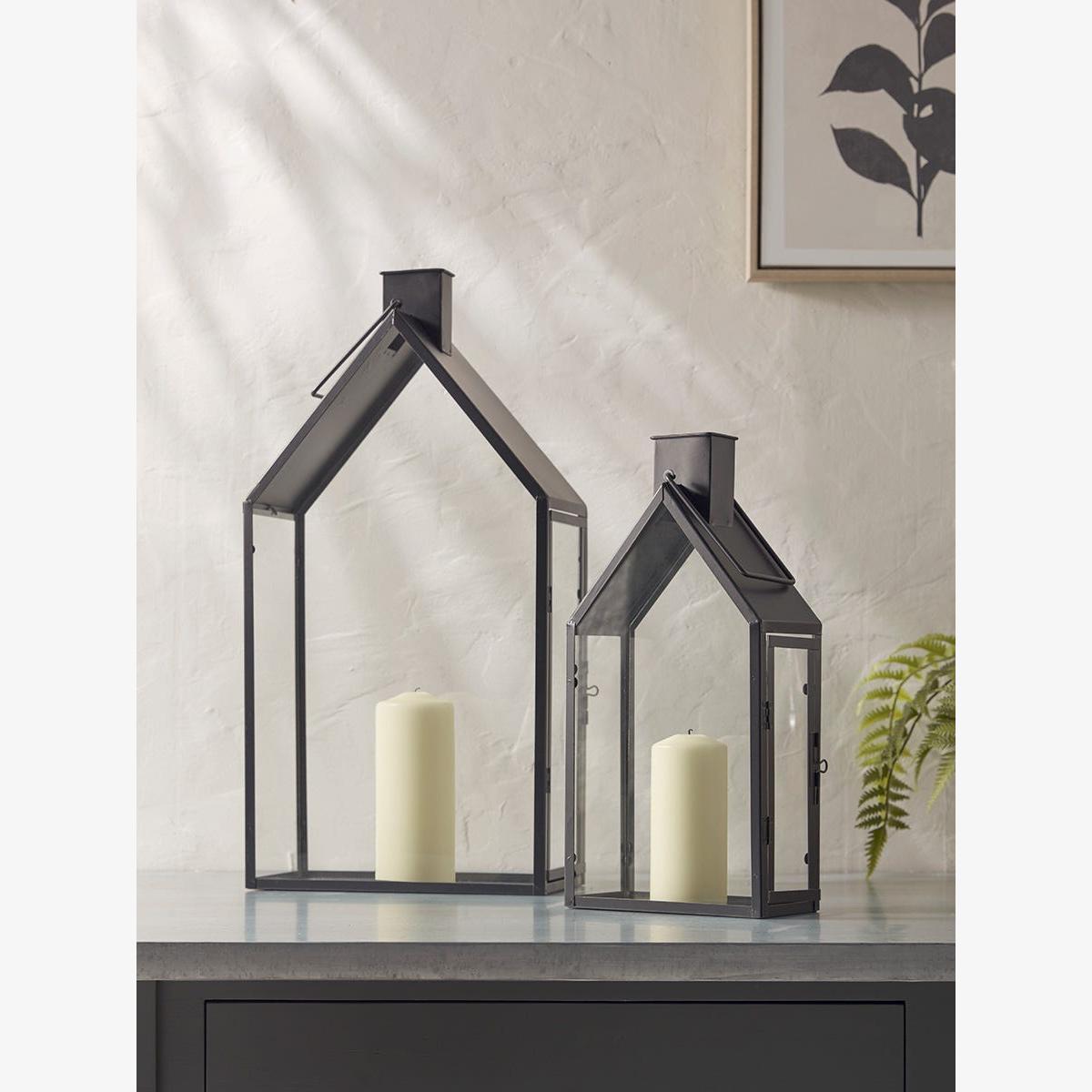I love the two house lanterns for their simple, modern silhouette that adds a touch of understated elegance to any interior. They work particularly well in contemporary, Scandi, and minimalist schemes, but can also be styled alongside rustic or industrial decor for an eclectic look. Practical styling tips include grouping different sizes together on a console table or sideboard to create visual interest, or using them as focal points in a mantel vignette. They are versatile, and when paired with pillar candles, add warmth and ambience, making them perfect for both day-to-day styling and special occasions.