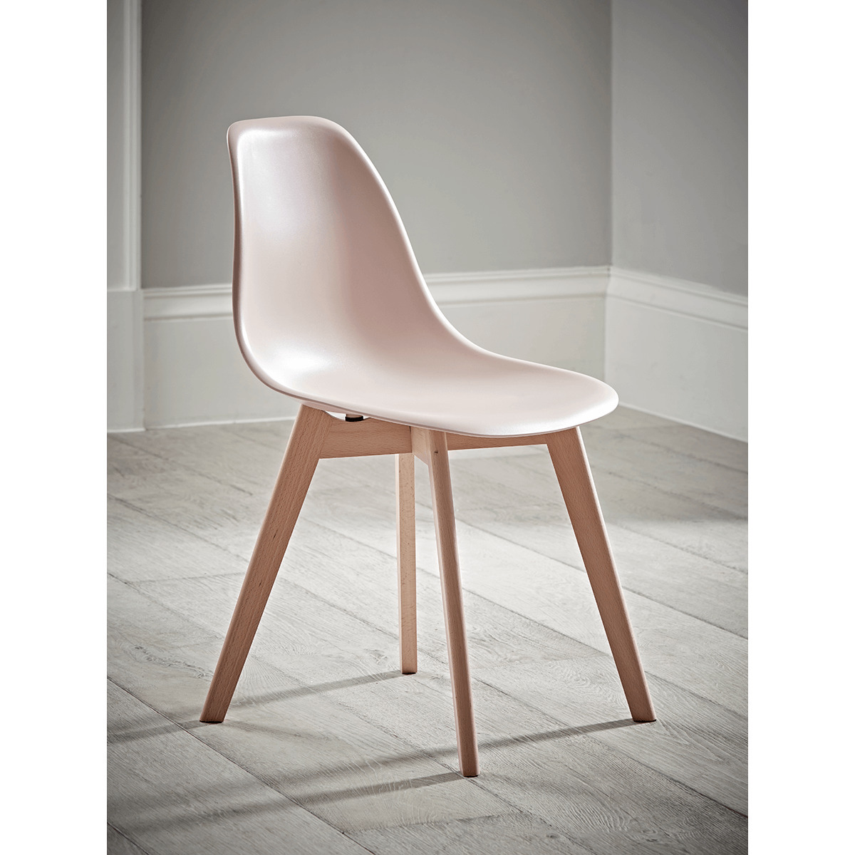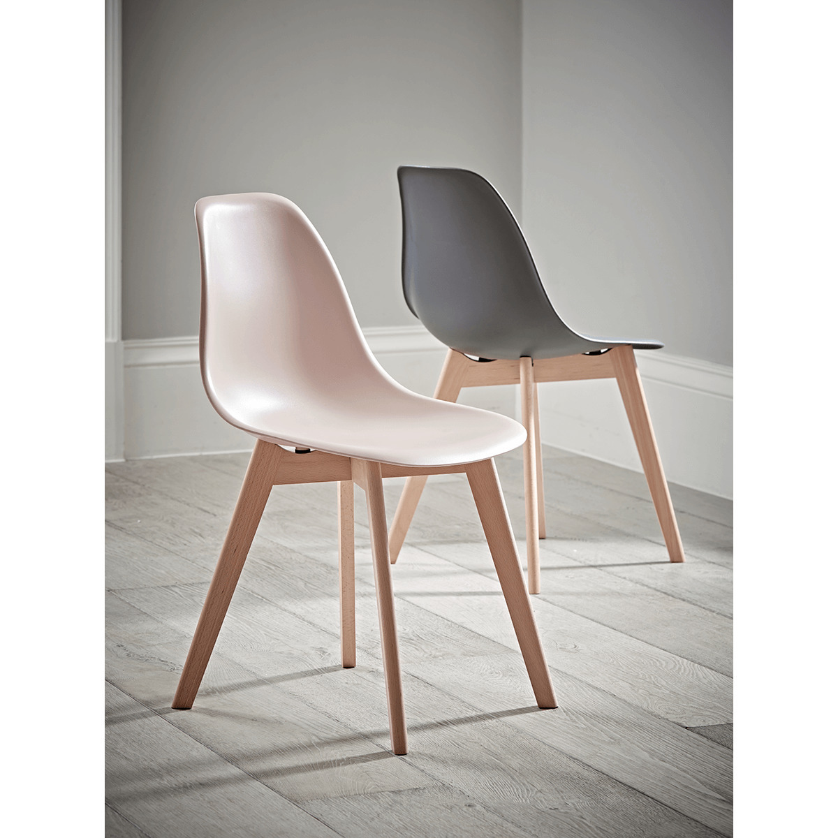 With comfortable moulded plastic seats, slender, tapered legs and a retro silhouette, these scooped blush chairs will add a pop of colour to your dining room. Also available in grey.