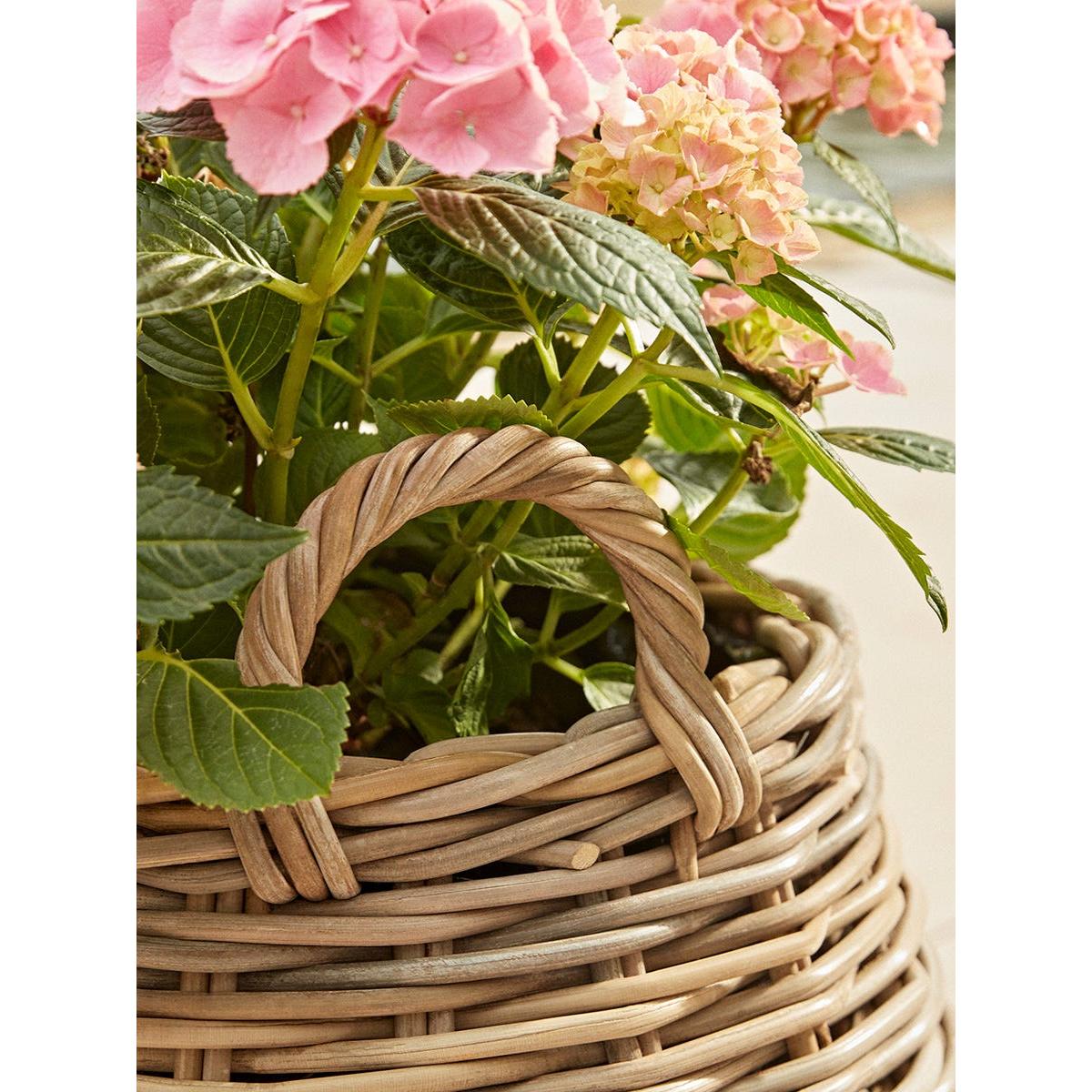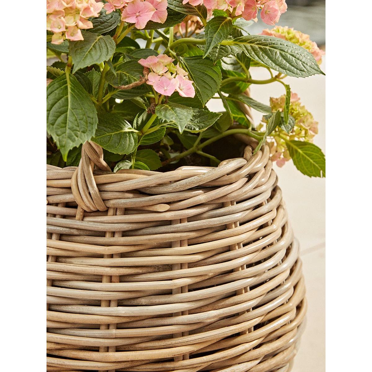 This charming set of planters is the ideal addition to a country cottage garden or an interior space with a rustic vibe. In wonderfully toned natural rattan each planter has a comfortingly curvaceous body and is set on little mahogany feet. The planters are lined with black plastic and can be displayed indoors or out with your preferred real of faux planting.  Each set includes one small and one large planter.