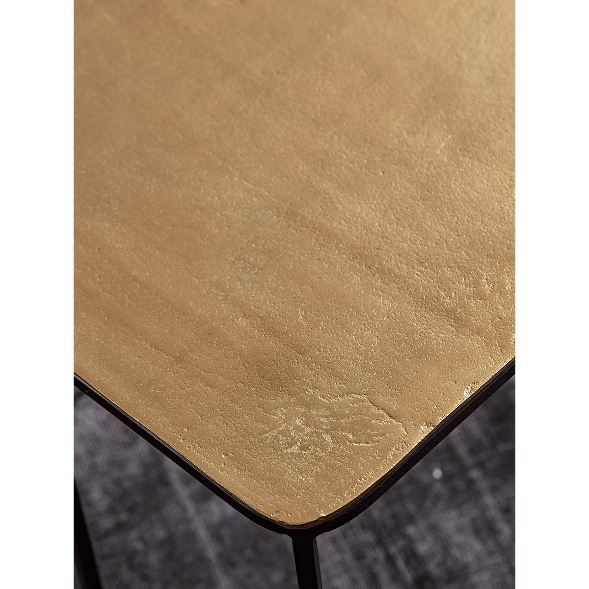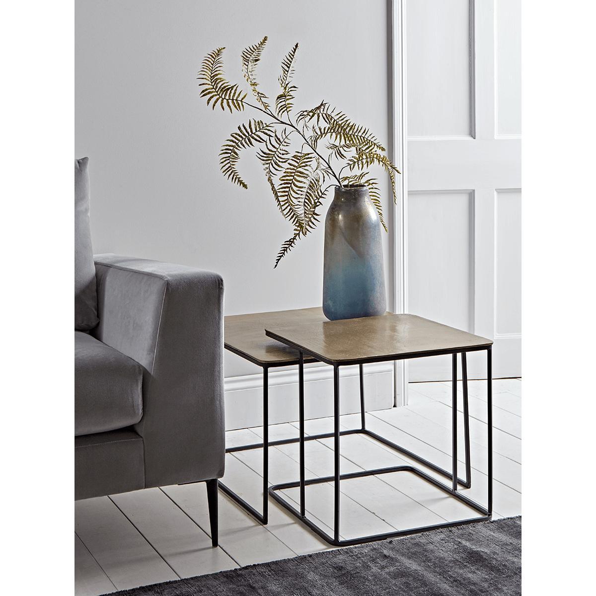 Crafted from industrial black iron with a striking brass top, our set of two nesting tables will make a statement in any home. This set consists of one taller rectangular shape table and one larger square table, each piece featuring a brass top and slender, angular black frame.