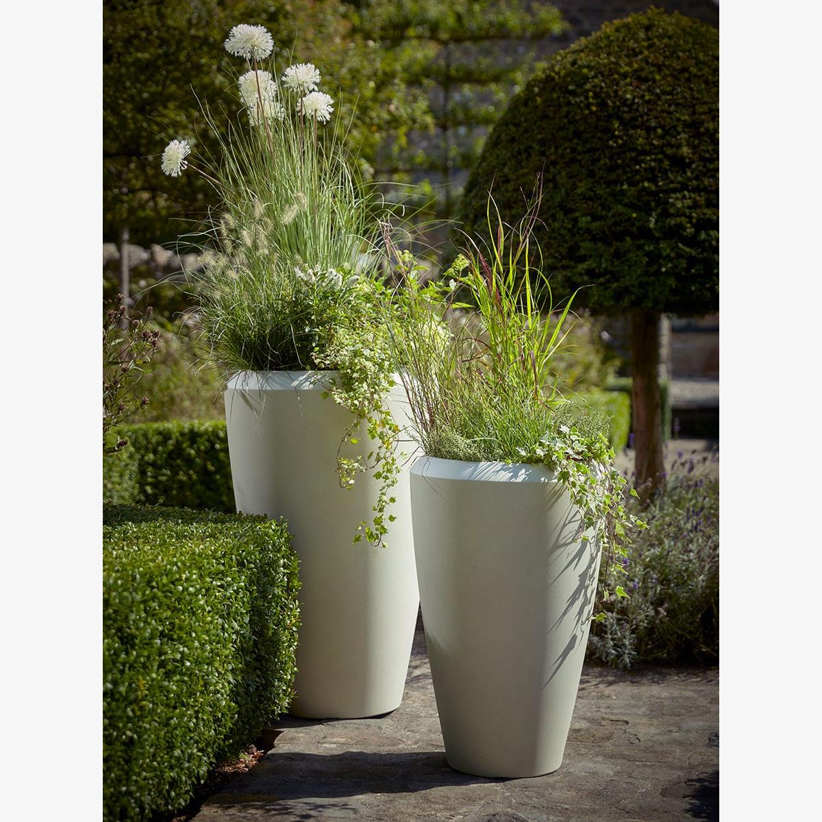 I love these oversized tapered pots for their clean, modern silhouette that instantly elevates any space. They work especially well in contemporary or minimalist interiors, but can also add a striking contrast in more traditional settings. The tall, tapered design creates visual interest and provides a great opportunity to showcase taller plants or statement greenery. Practical styling tips include pairing them with a mix of lush foliage and flowering plants for colour variation, and placing them on sleek stands or bases to highlight their shape. Because of their generous size, they’re perfect for entryways, patios, or large living room corners where they can truly stand out as statement pieces.