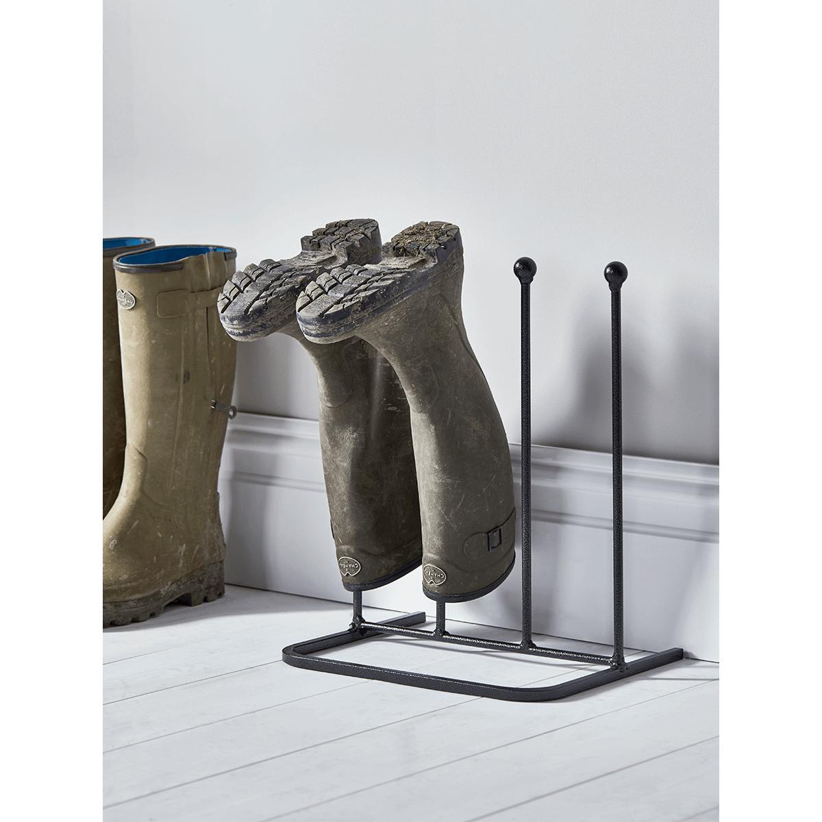 An essential for any hallway or porch, our classic two-pair boot rack is the perfect tool for storing muddy boots of all sizes. Made from durable and weather resistant cast iron, each rack includes four high spokes with rounded ends and a rectangular base that’s sturdy but can be placed against a wall. Need more space? Take a look at our. Four Pair Metal Boot Rack. Or our. Six Pair Metal Boot Rack.